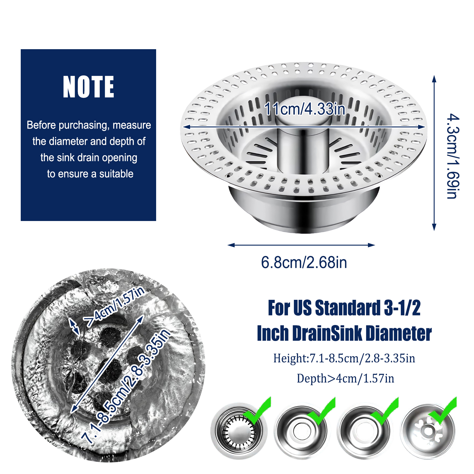 Tired of sink stoppers that wobble, leak, or simply won't fit? Our kitchen drain stopper is engineered to match the exact specifications of US standard sinks. With a precisely calibrated diameter spanning 2.8 - 3.35 inches and a depth exceeding 1.69 inches, it slides seamlessly into place, forming a watertight seal in most 3-1/2 inch sewers. No more frustrating trial-and-error purchases; this strainer is a tailor-made solution, eliminating gaps and ensuring a snug, secure fit every time. Whether you're renovating your kitchen or replacing an old stopper, trust that our design will integrate flawlessly with your existing setup, saving you time and hassle.