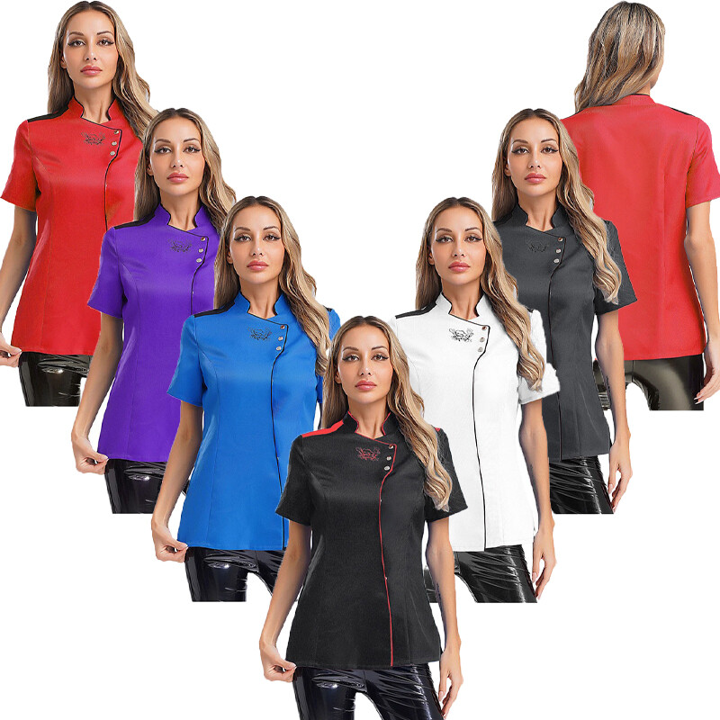 Women Jacket Baking Tops Servers Coat Uniform Printed Stand Collar Color Block