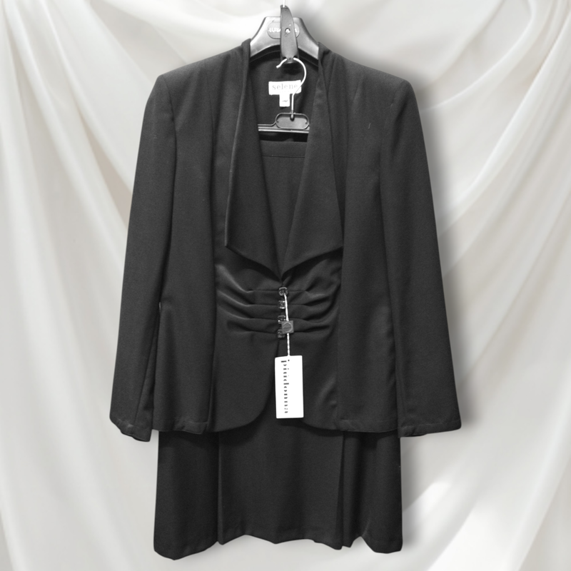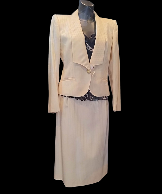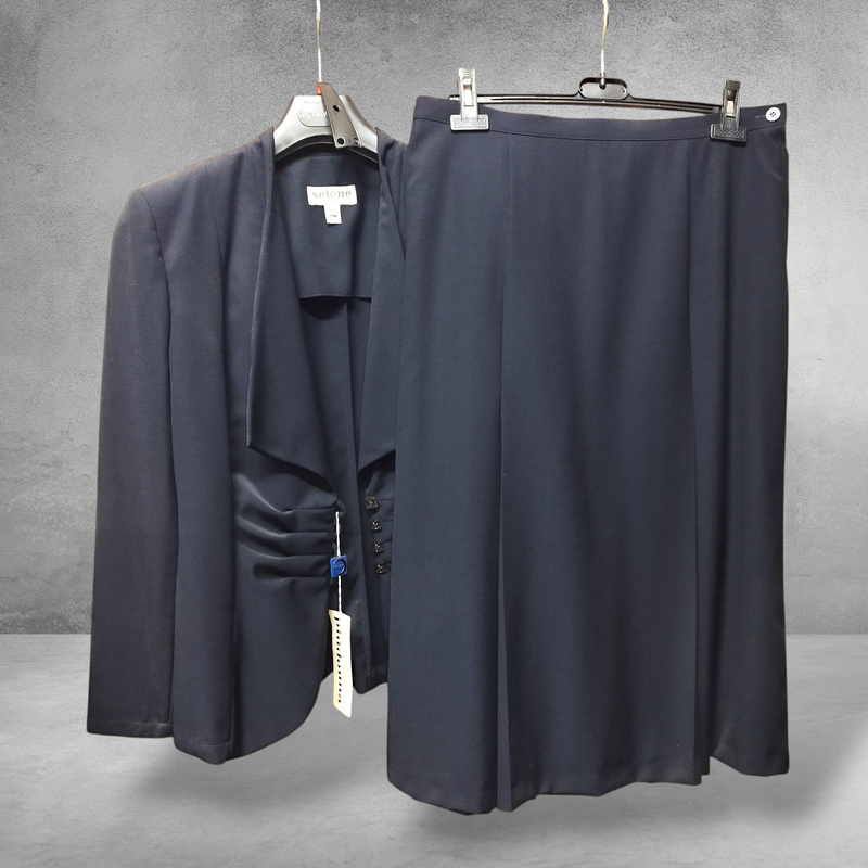 BRAND STORY: CORI® BY GFT GROUP 2) Black PiùDonna® by Selene® - Curvy Cut Tailleur (PiùDonna® label - late 80s curvy fit)This black tailleur is a softer, curvier take on the classic Italian suit — branded PiùDonna® by Selene® and produced in Italy with excellent construction and materials aimed at comfortable, modern curves. The design favors a more generous cut through the body while preserving an elegant, dressy presence suitable for evening events and formal daytime use. Key features (black PiùDonna® tailleur):
