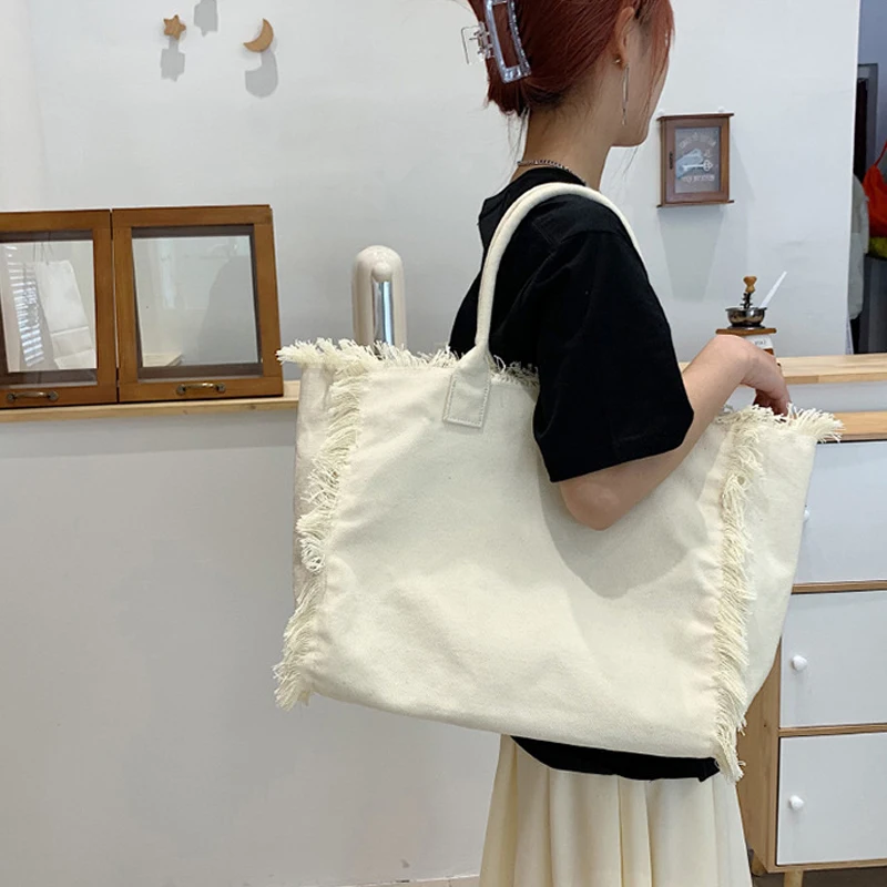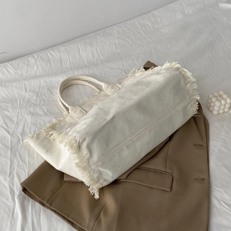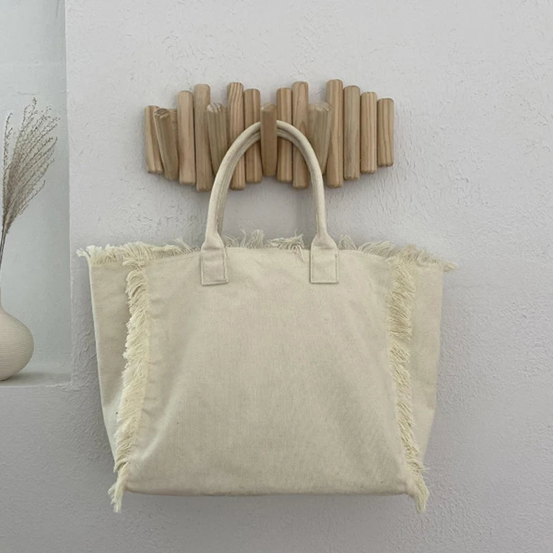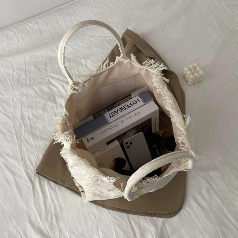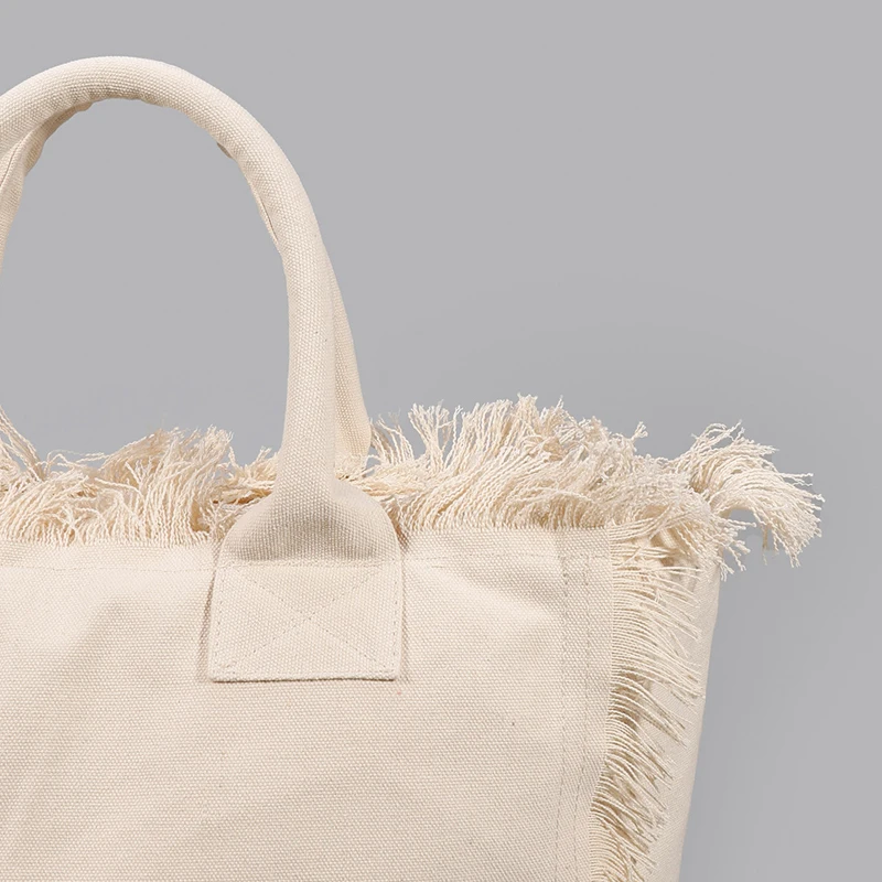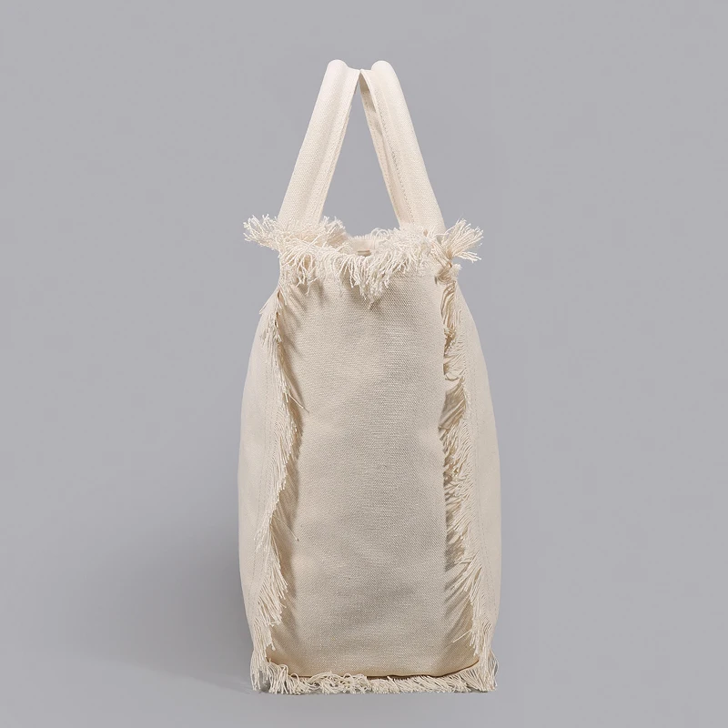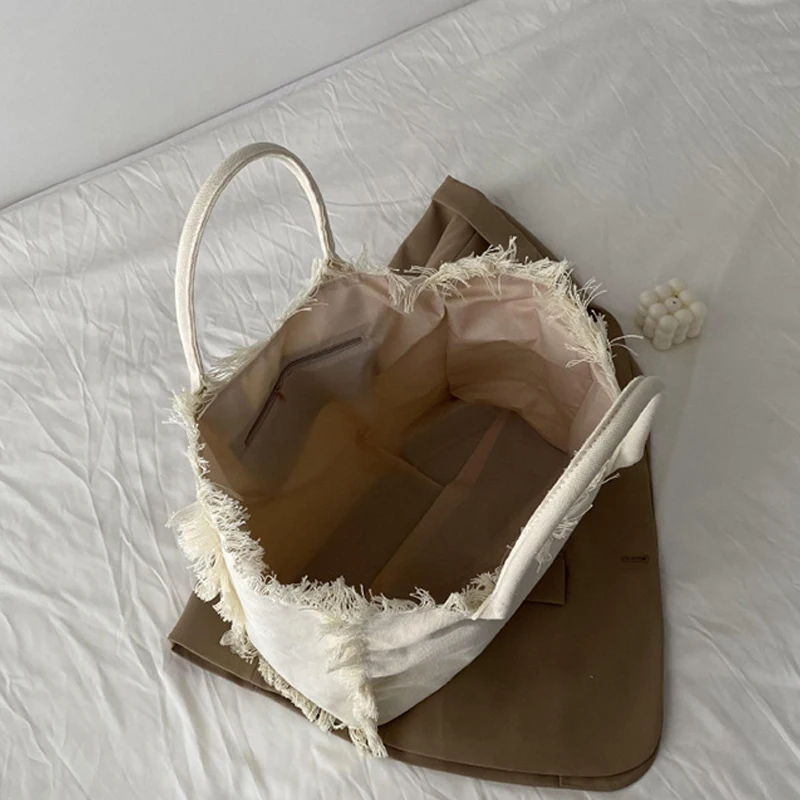 This tote bag is made of canvas, with an open design, an interior zipper pocket, an interior patch pocket, and tassel trims.