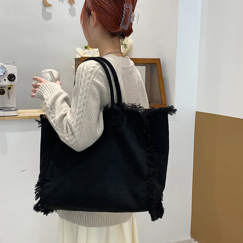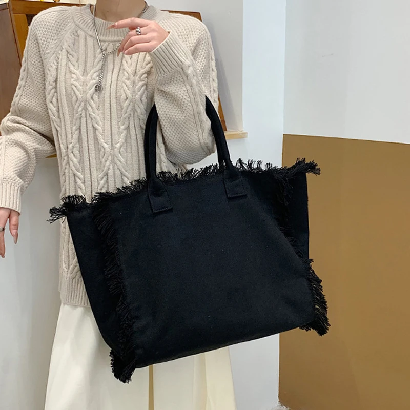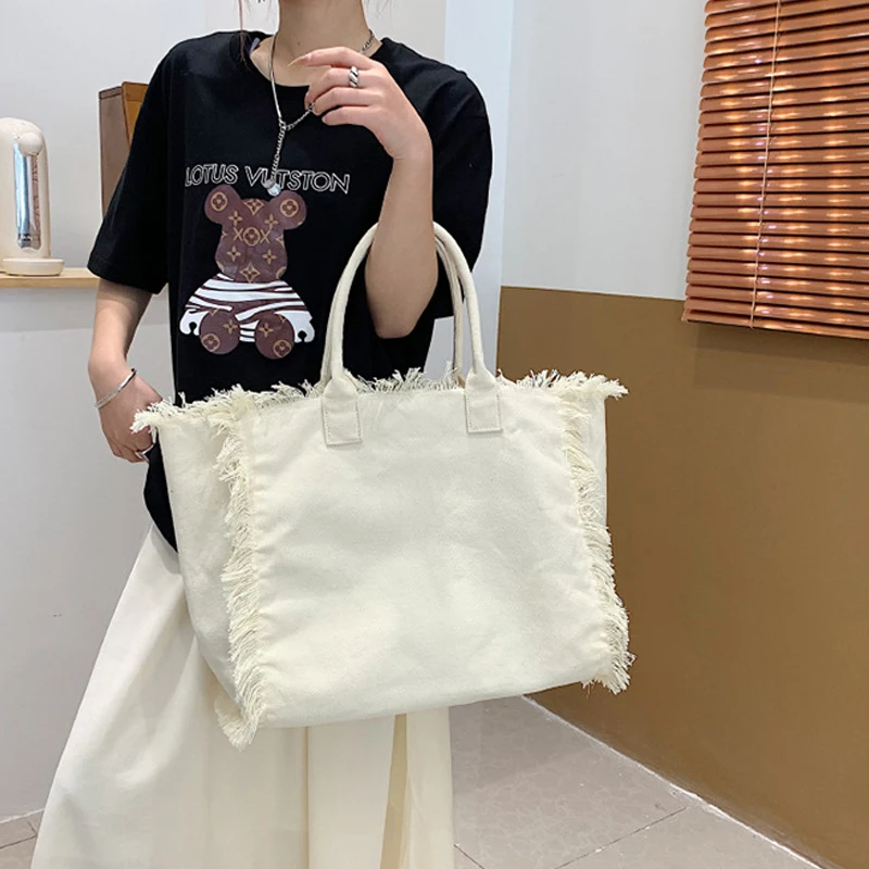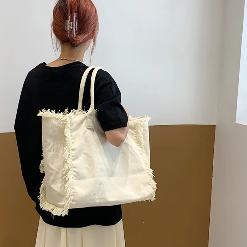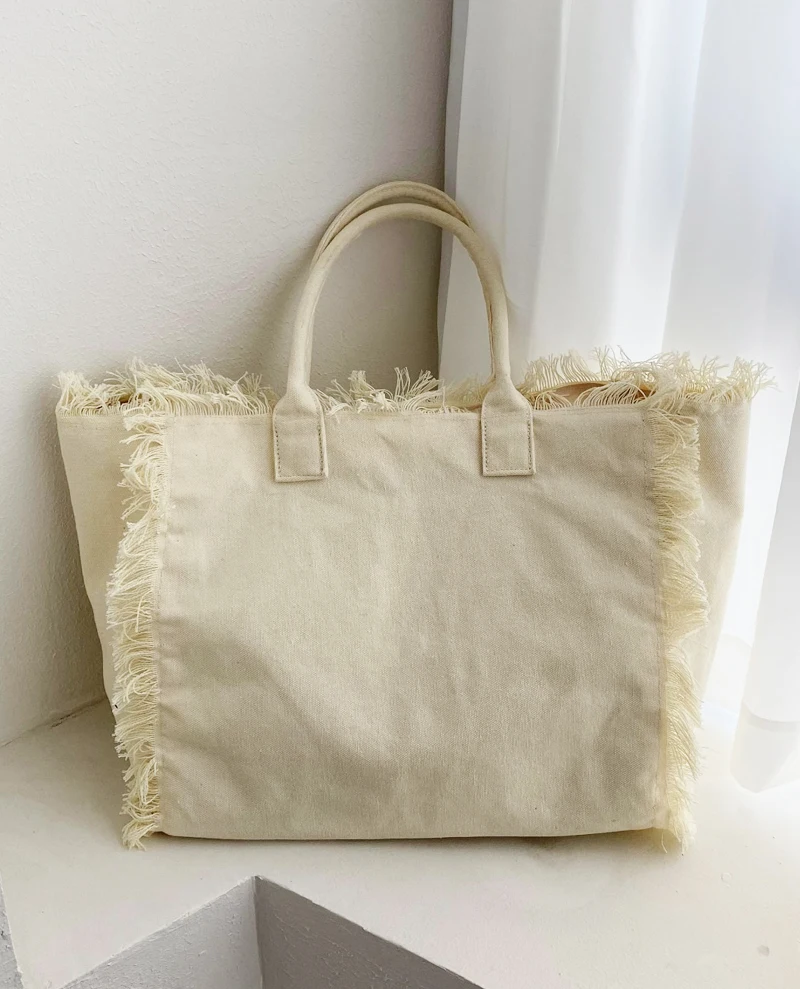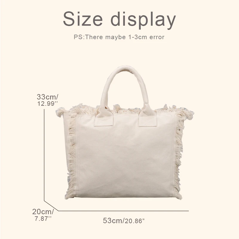 This tote bag is made of canvas, with an open design, an interior zipper pocket, an interior patch pocket, and tassel trims.