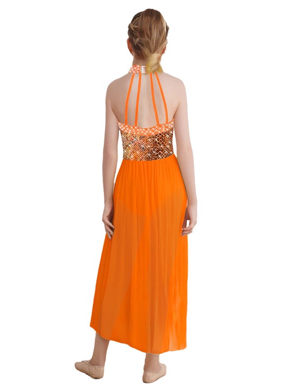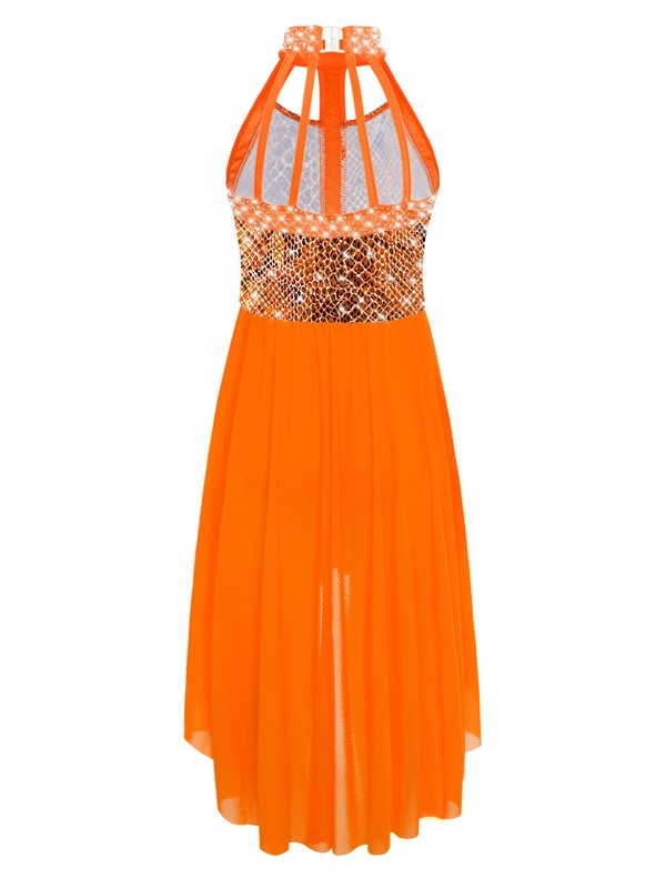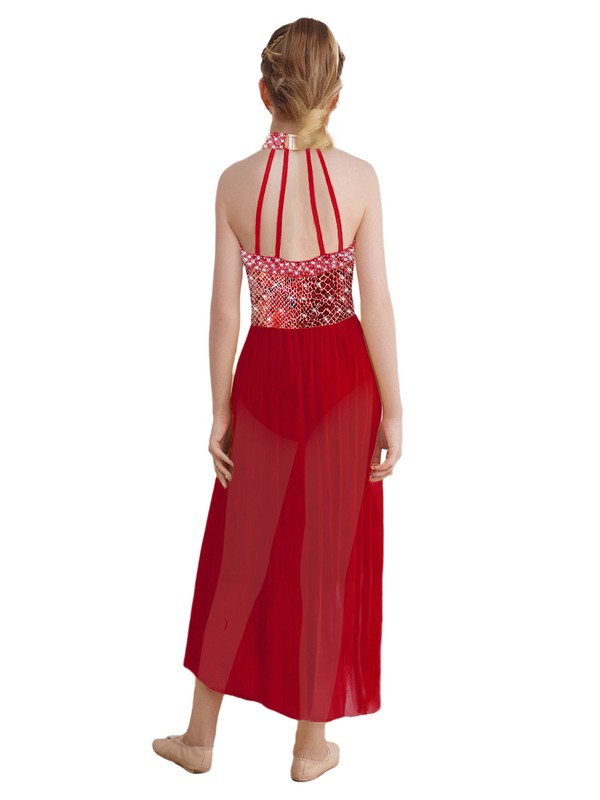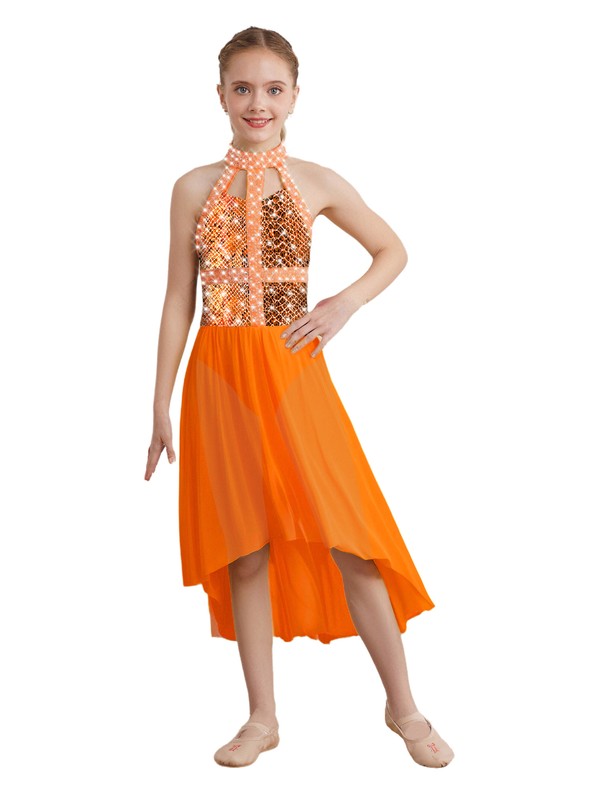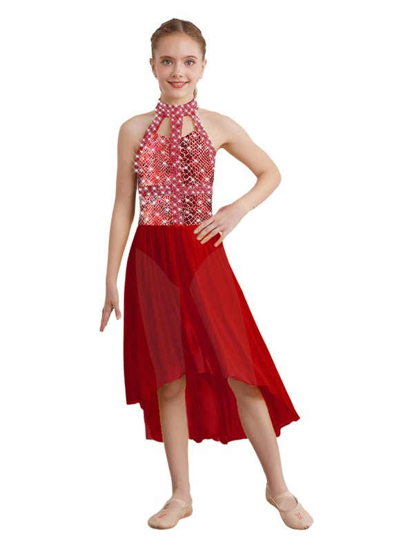 The halter and sleeveless design is both trendy and practical, allowing for unrestricted arm movement during dance routines and showing off the dancer’s shoulders and neckline stylishly.