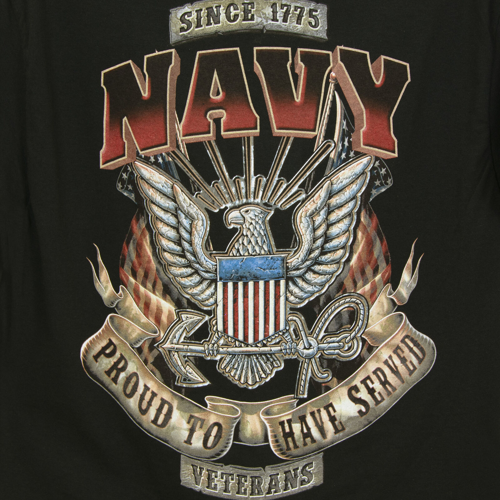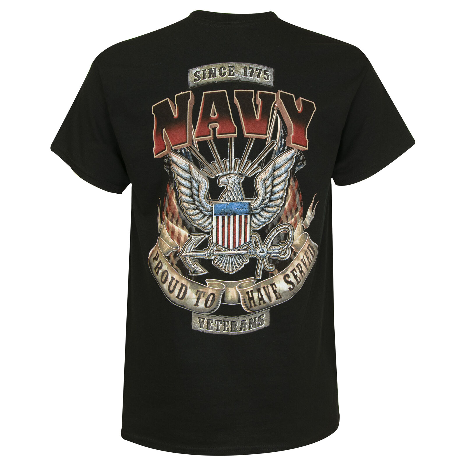 - The bold, screen-printed Navy eagle logo/design on the front and back of this veterans t-shirt declares "Proud to Have Served."