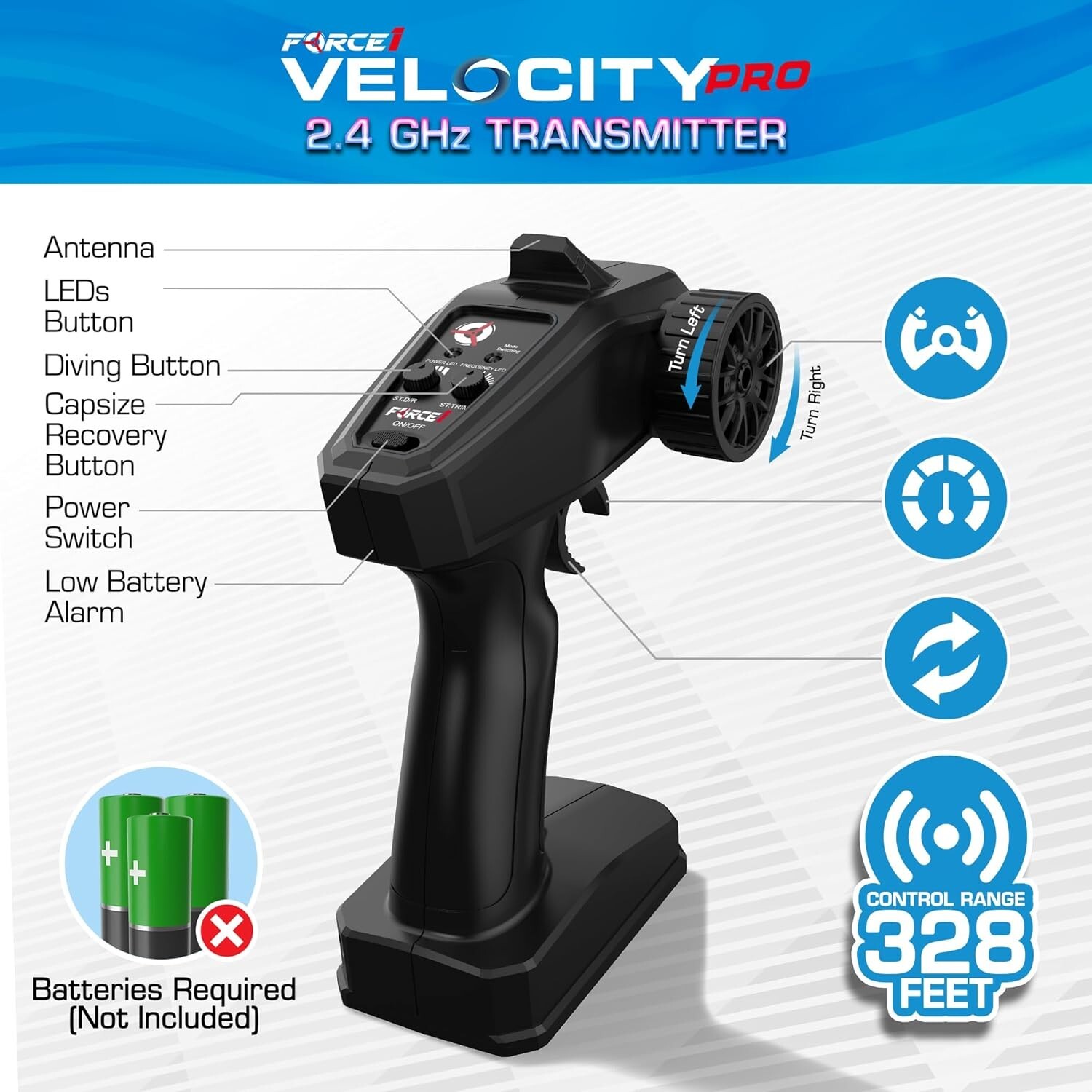 Advanced Remote Control: Navigate with ease using a smart 2.4GHz remote control-transmitter featuring an LCD display for signal/power monitoring, trim adjustments, Left-Right throttle switch mode, and emergency stop function.