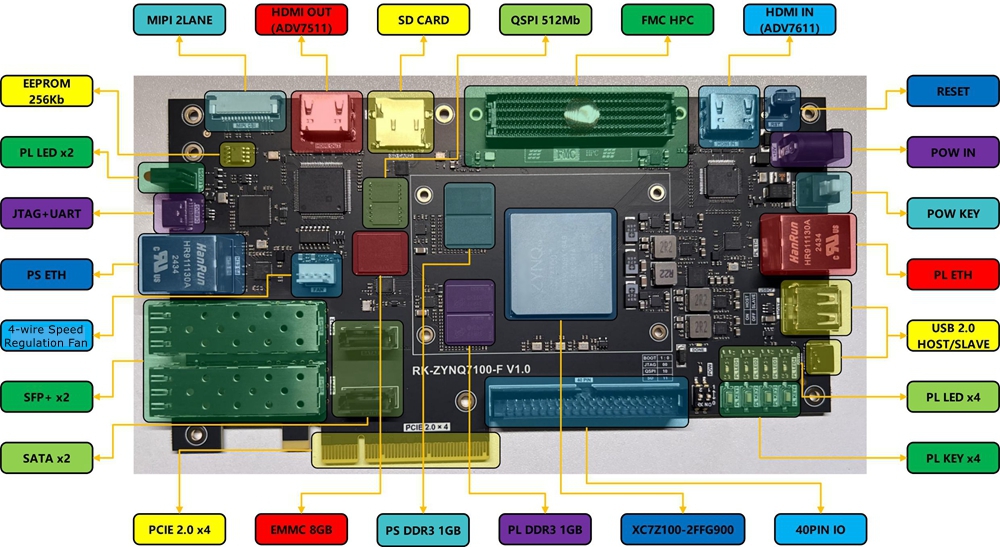 - The expanded interfaces include: two SFP+, two SATA, one PS ETH, one PLETH, onboard JTAG+UART 2-in-1, one four wire adjustable fan, one EEPROM, one MIPI, one HDMI-compatible input, one HDMI-compatible output, one SD CARD, one FMC HPC interface, one USB 2.0 HOST/SLAVE, six PL LEDs, four PL KEYs, one 40PIN IO interface, and one PCIE2.0 x4 interface.
