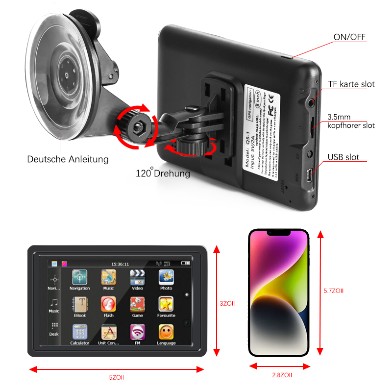 【Multimedia - Musik, Videos und Bilder】GPS navigation mit 8GB internem speicher (erweiterbar) und 128MB RAM. Das gerät unterstützt MicroSD-Datenträger (bis ca. 32GB). Abspielbare formate wie MPEG4, MP3, JPEG, AVI, WMA uvm. Eingebaute wiederaufladbare 2100 mAh Li-Batterie, es hat eine längere laufzeit, aufladen über autoladegerät.
