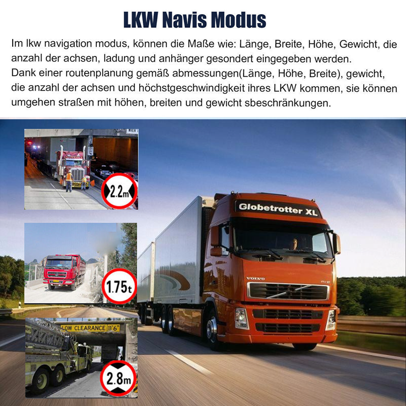 【Professional PKW LKW-Navis Modus】Dank einer routenplanung gemäß abmessungen(Länge, Höhe, Breite), gewicht, die anzahl der achsen und höchstgeschwindigkeit ihres LKW kommen, sie können umgehen straßen mit Höhen, Breiten und Gewicht sbeschränkungen. Du kommst immer gut an Deinem ziel an.