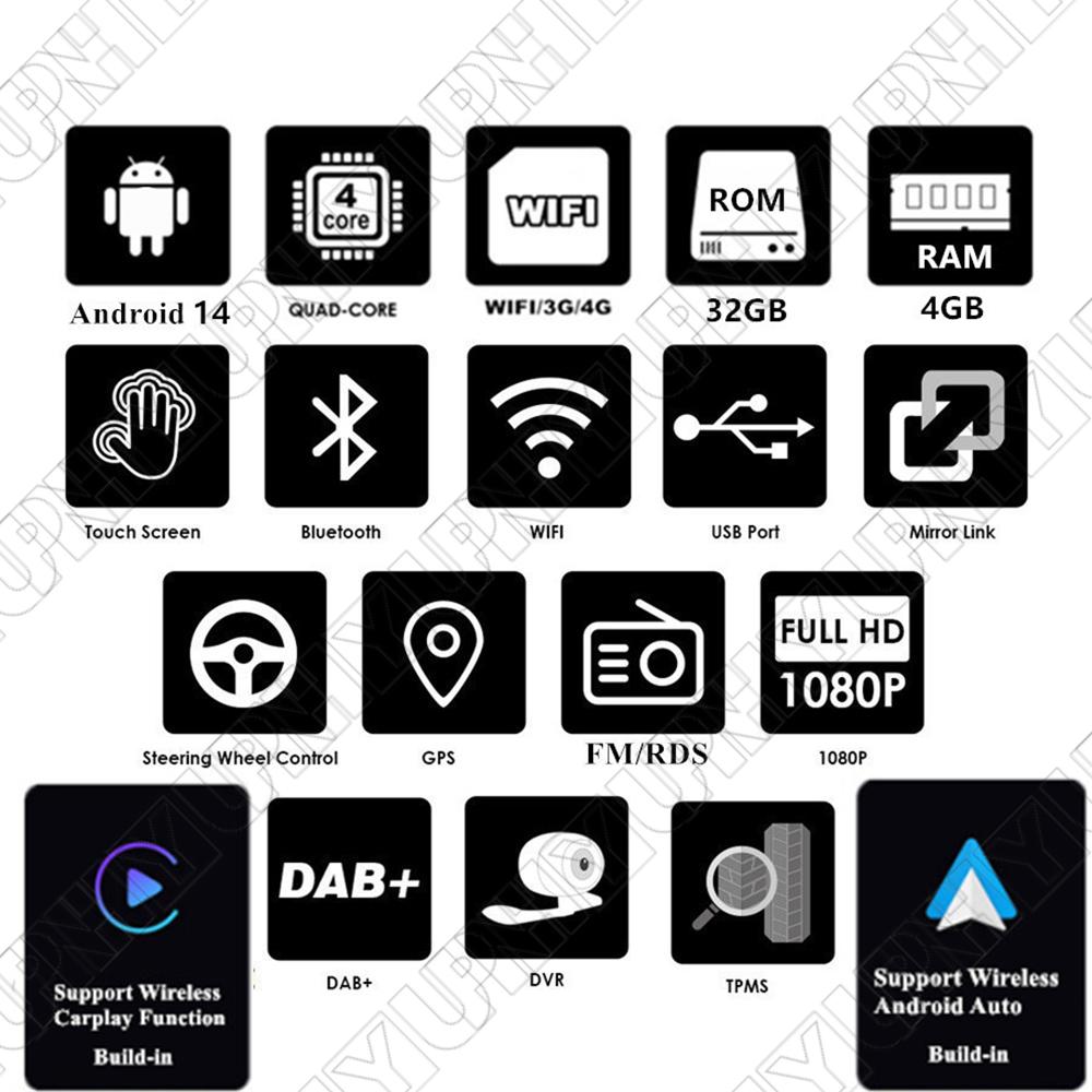 - Textbook: Could change font, font color, background color, bookmark, reading E-book while listening music - Photo Viewer: Support JPS, BMP, PNG, GIF etc. format. play by revolve, Powerpoint Support 4096*4096 Pixels - Wallpapers: 5 live wallpapers, 17 standard wallpapers, support DIY wallpaper from Gallery - APK Installer: Support Android Package installer - Support Torque Pro(OBD2 &Car): Yes, you can connect a Bluetooth/WIFI OBD2 Scanner Tool(Bluetooth version ≥ 4.2) to use this function - Support Mirror Link function: Yes, support wireless and wired screen mirroring from iPhone and android smartphone - Support TPMS: YES (Not Included) -Support Steering Wheel Control;Yes |