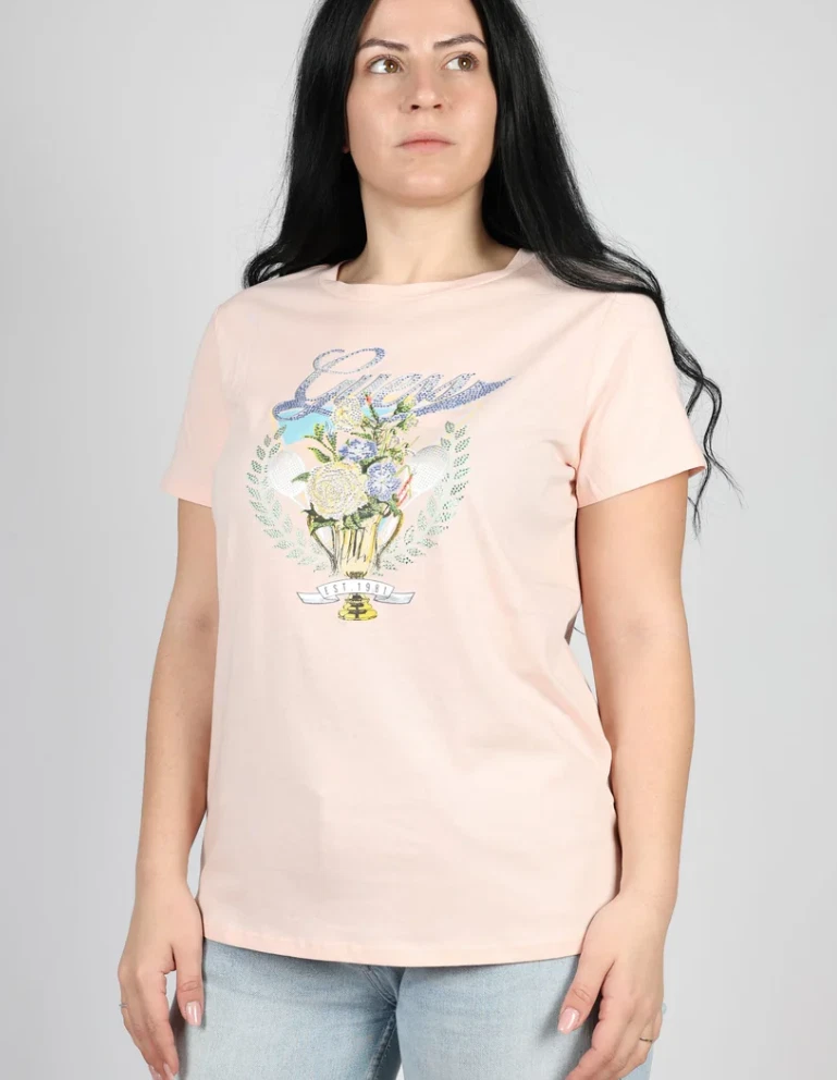 The Guess Women T-Shirt in pink, size small, is a stylish and comfortable addition to any casual wardrobe. Featuring a solid pattern, short cap sleeves, and a round neckline, this pullover top is made of soft cotton jersey fabric. Perfect for the summer and spring seasons, this basic t-shirt is easy to care for with machine washable instructions. The Guess brand ensures quality and trendy style, making this t-shirt a versatile choice for everyday wear.