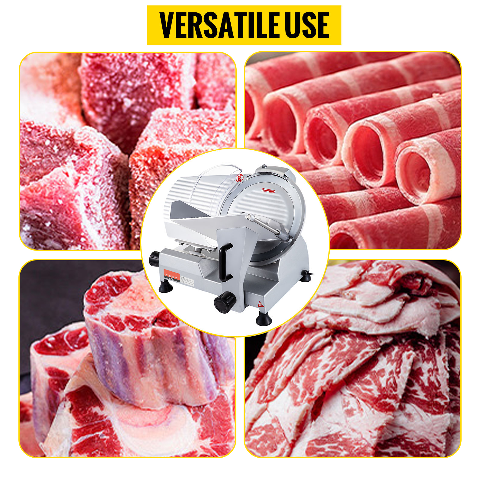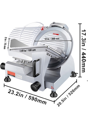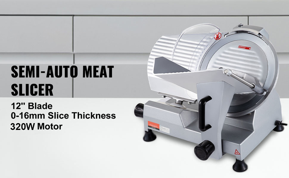 La trancheuse est fabriquée en alliage d'aluminium robuste, tandis que sa lame de 12 pouces de diamètre est conçue en acier au carbone 45#. Grâce à son bord affûté, elle offre une découpe rapide et précise de la viande. De plus, la surface rainurée de la lame réduit efficacement l'adhérence des morceaux de viande pendant l'utilisation.