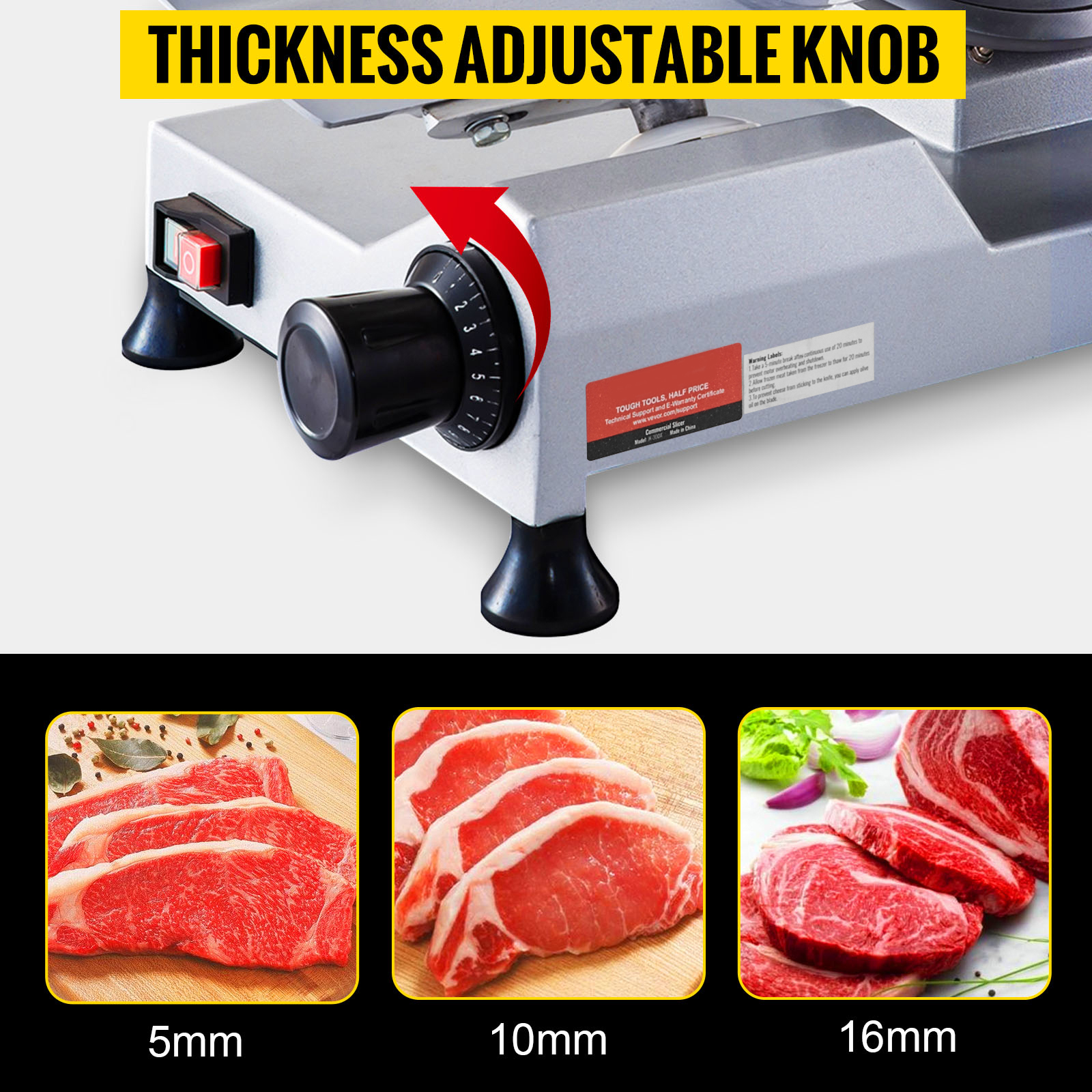 Cet appareil est équipé d'un bouton permettant de régler l'épaisseur, vous offrant une maîtrise totale pour ajuster la taille de vos tranches entre 0 et 15 mm (0-0,59 pouce). Cette trancheuse à viande est idéale pour découper avec efficacité tout en garantissant une précision adaptée à vos besoins.