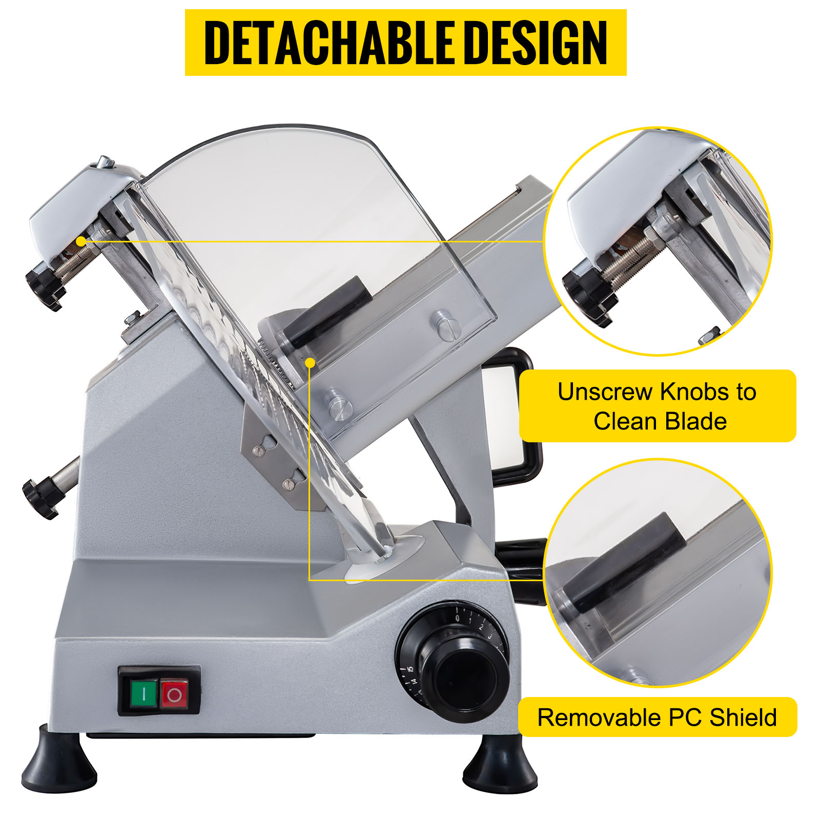 Les roues internes facilitent l'affûtage des lames. Le protège-lame est conçu pour réduire les risques d'accidents. Le poussoir alimentaire assure une fixation solide des aliments pendant la découpe. L'interrupteur étanche offre une manipulation simple et sécurisée. Les pieds antidérapants en caoutchouc garantissent une stabilité optimale lors de l'utilisation.