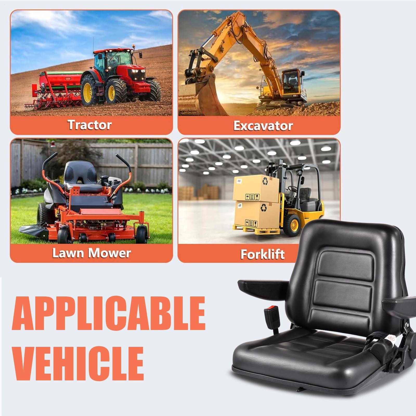 Increased Versatility: The forklift seat is an ideal fit for different farm and construction equipment, including lawn mowers and other agricultural machinery. It's suitable for various models of UTV, ATV, RTV, golf carts, and lifts for most heavy machinery seats, such as bulldozers, ensuring comfortable operating for prolonged periods