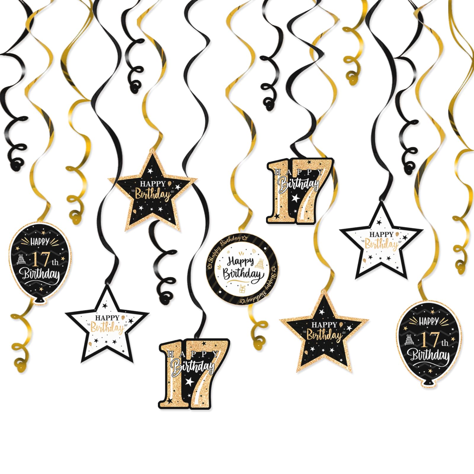 - [WAHT YOU GET]:🎁You Will Get 15 pcs “Happy 17th Birthday" Swirls Streamers - Black & Gold Glitter Detail, It Will be a Good Helper to Light Up Your Theme Birthday Party by Decorating with These Colorful Streamers Decorations, Easily Create a Strong Birthday Atmosphere in Your House.