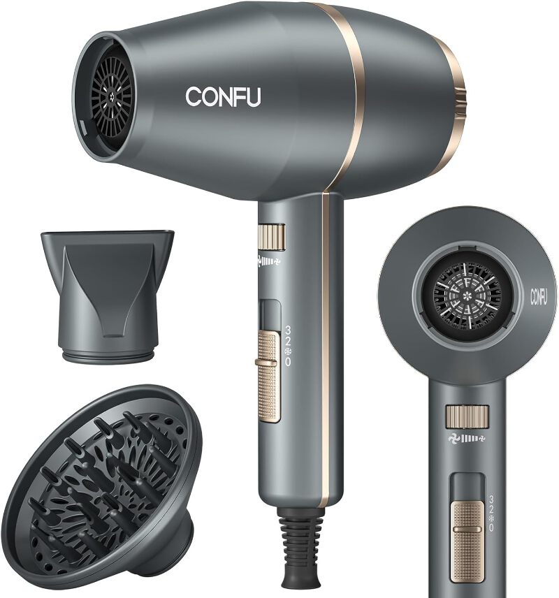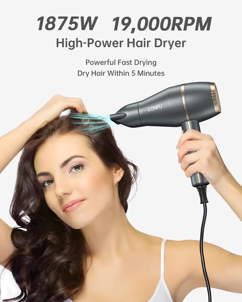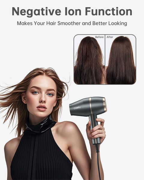 • 𝟏𝟖𝟕𝟓 𝐖𝐚𝐭𝐭 𝐍𝐞𝐠𝐚𝐭𝐢𝐯𝐞 𝐈𝐨𝐧𝐢𝐜 𝐇𝐚𝐢𝐫 𝐃𝐫𝐲𝐞𝐫: CONFU Hair Dryer Negative Ion Function, Makes Your Hair Smoother and Better Looking. High - Power Hair Dryer, Faster drying means time-saving and less damage to your hair.