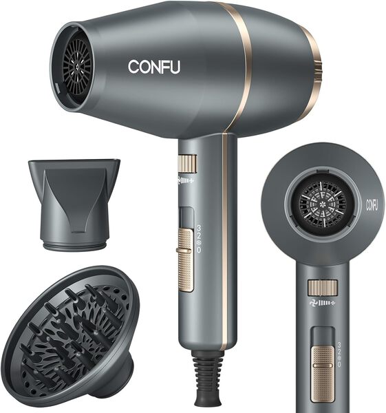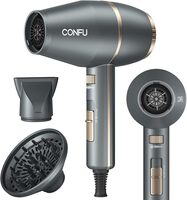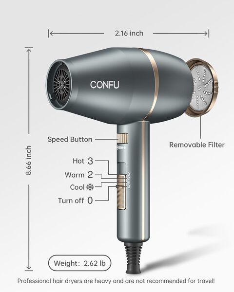Brand CONFU Color Gray Material Aluminum, Plastic Wattage 1875 watts Power Source Corded Electric About this item 𝐂𝐎𝐍𝐅𝐔 𝐏𝐫𝐨𝐟𝐞𝐬𝐬𝐢𝐨𝐧𝐚𝐥 𝐇𝐚𝐢𝐫 𝐃𝐫𝐲𝐞𝐫: CONFU HairDryer is Designed for Different Hair Types, professional hair dryer is assembled with professional motor, which has a longer service life and is more durable than other hair dryers. On the other hand, it increases the weight of the hair dryer itself, so it is not recommended to carry it when traveling! 𝟏𝟖𝟕𝟓 𝐖𝐚𝐭𝐭 𝐍𝐞𝐠𝐚𝐭𝐢𝐯𝐞 𝐈𝐨𝐧𝐢𝐜 𝐇𝐚𝐢𝐫 𝐃𝐫𝐲𝐞𝐫: CONFU Hair Dryer Negative Ion Function, Makes Your Hair Smoother and Better Looking. High - Power Hair Dryer, Faster drying means time-saving and less damage to your hair. 𝐇𝐚𝐢𝐫 𝐃𝐫𝐲𝐞𝐫 𝐰𝐢𝐭𝐡 𝟑 𝐇𝐞𝐚𝐭 𝐒𝐞𝐭𝐭𝐢𝐧𝐠𝐬 & 𝐒𝐭𝐞𝐩𝐥𝐞𝐬𝐬 𝐒𝐩𝐞𝐞𝐝 𝐂𝐡𝐚𝐧𝐠𝐞: Cool/Warm/Hot, and there is a stepless speed adjustment button, which can adjust the wind speed arbitrarily, with infinite wind speed setting, easy to control the temperature and wind speed to make your favorite hairstyle at home. 𝐀𝐭𝐭𝐚𝐜𝐡𝐦𝐞𝐧𝐭𝐬 𝐟𝐨𝐫 𝐀𝐥𝐥 𝐇𝐚𝐢𝐫 𝐓𝐲𝐩𝐞𝐬: Hair dryers for women & men. With 1 Concentrator & 1 Diffuser for All Hair Types, Concentrators nozzle is ideal for precision styling on straight, smooth hair. Diffuser designed to enhance your natural curl and texture,Designed with double safety removable back cover, your hair will not get sucked into the blow dryer easily, and it is easy to clean.Kind Tips: Please do not touch the air nozzle during use to prevent burns. 𝐂𝐎𝐍𝐅𝐔 𝐒𝐚𝐟𝐞𝐭𝐲 𝐏𝐫𝐨𝐭𝐞𝐜𝐭𝐢𝐨𝐧 & 𝐋𝐨𝐰 𝐑𝐚𝐧𝐝𝐢𝐚𝐭𝐢𝐨𝐧 𝐇𝐚𝐢𝐫 𝐃𝐲𝐫𝐞𝐫: Small hair dryer When the temperature is too high, the ion hair dryer has an overheat protection function that automatically shuts off, ensuring the safety of your family. The CONFU hair dryer comes with ETL certification, 125V 60HZ, ALCI safety plug. Please feel free to contact us if you have any questions about our hair dryer.