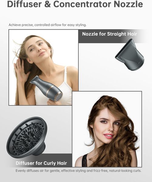 • 𝐀𝐭𝐭𝐚𝐜𝐡𝐦𝐞𝐧𝐭𝐬 𝐟𝐨𝐫 𝐀𝐥𝐥 𝐇𝐚𝐢𝐫 𝐓𝐲𝐩𝐞𝐬: Hair dryers for women & men. With 1 Concentrator & 1 Diffuser for All Hair Types, Concentrators nozzle is ideal for precision styling on straight, smooth hair. Diffuser designed to enhance your natural curl and texture,Designed with double safety removable back cover, your hair will not get sucked into the blow dryer easily, and it is easy to clean.Kind Tips: Please do not touch the air nozzle during use to prevent burns.