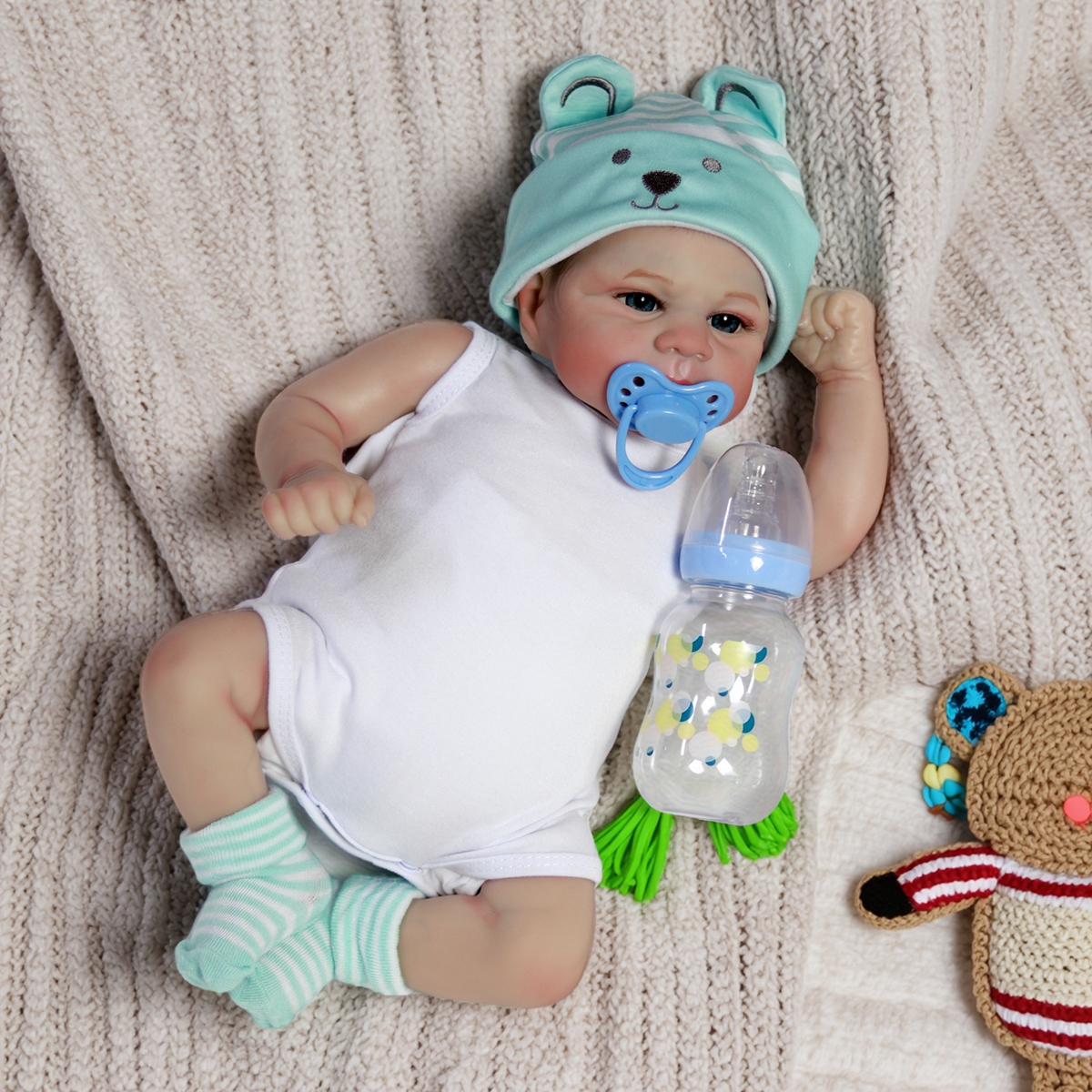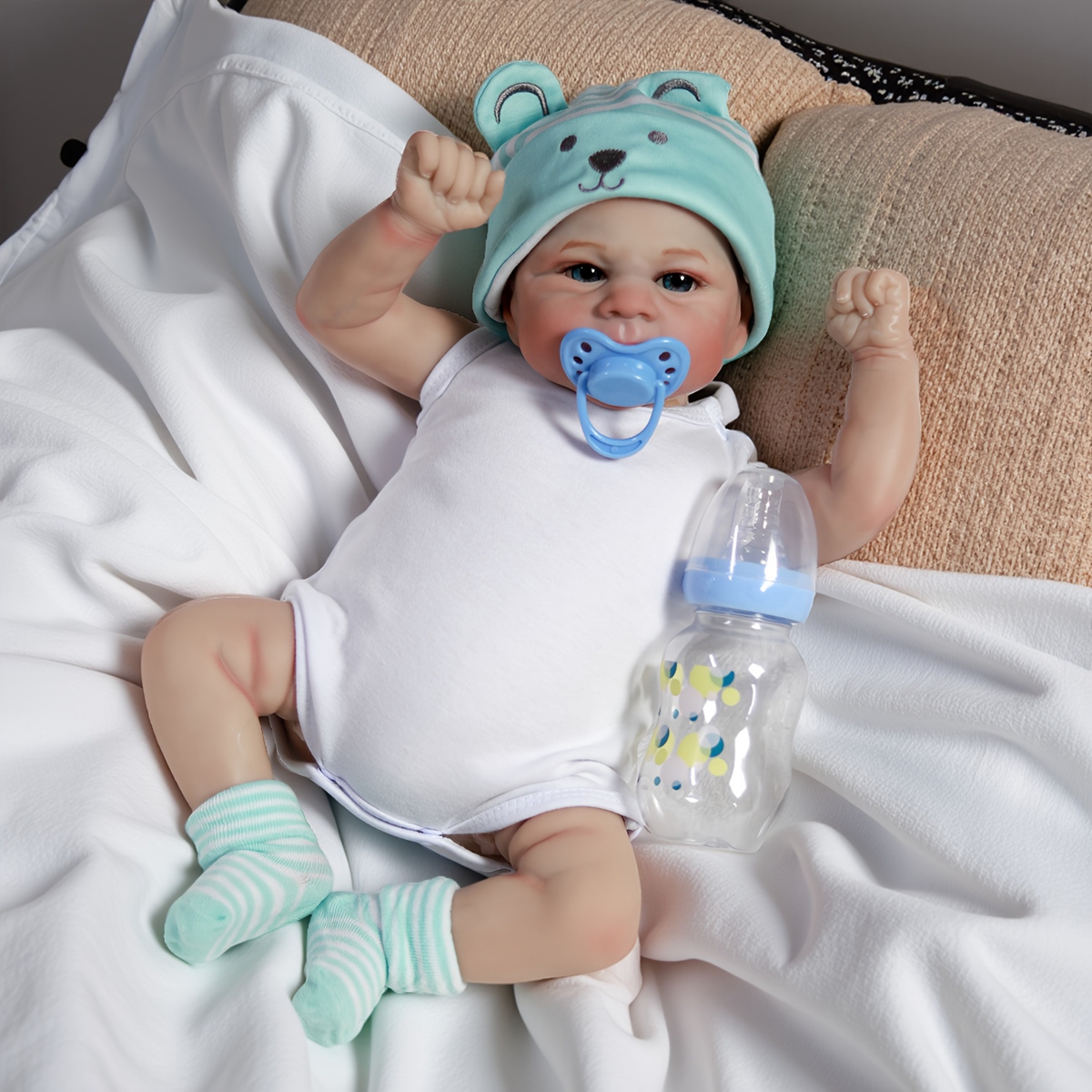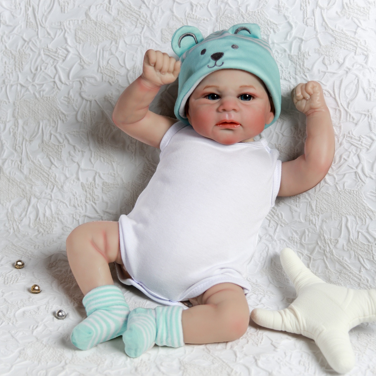 2.Joints of arms and legs are movable. The baby can sit, can lie down, can't standing, can't speaking,can't winking.
