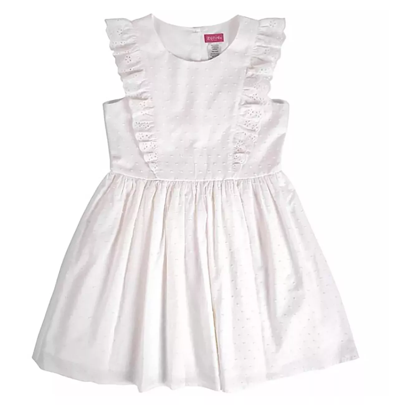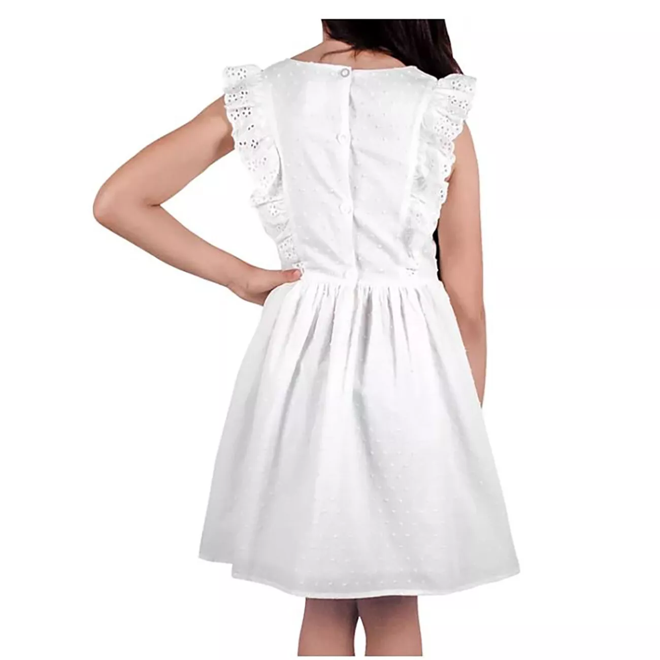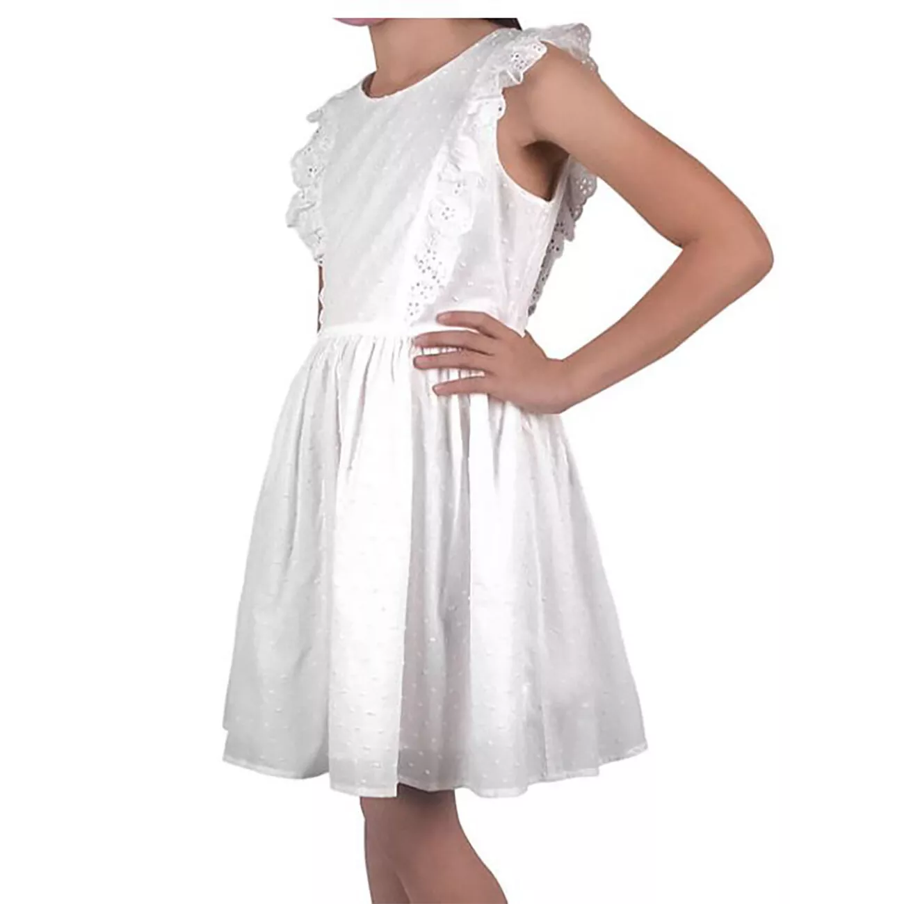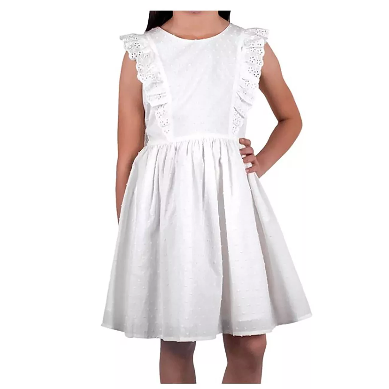 Watch her skip endlessly in this sweet textured clip dot woven cotton dress with beautiful ruffle detail on the bodice. Solid white textured clip dot woven cotton. Machine Wash. Material: 100% Cotton. This is a girl's size Small (6/6X), approximate measurements: 13" chest, 25" length