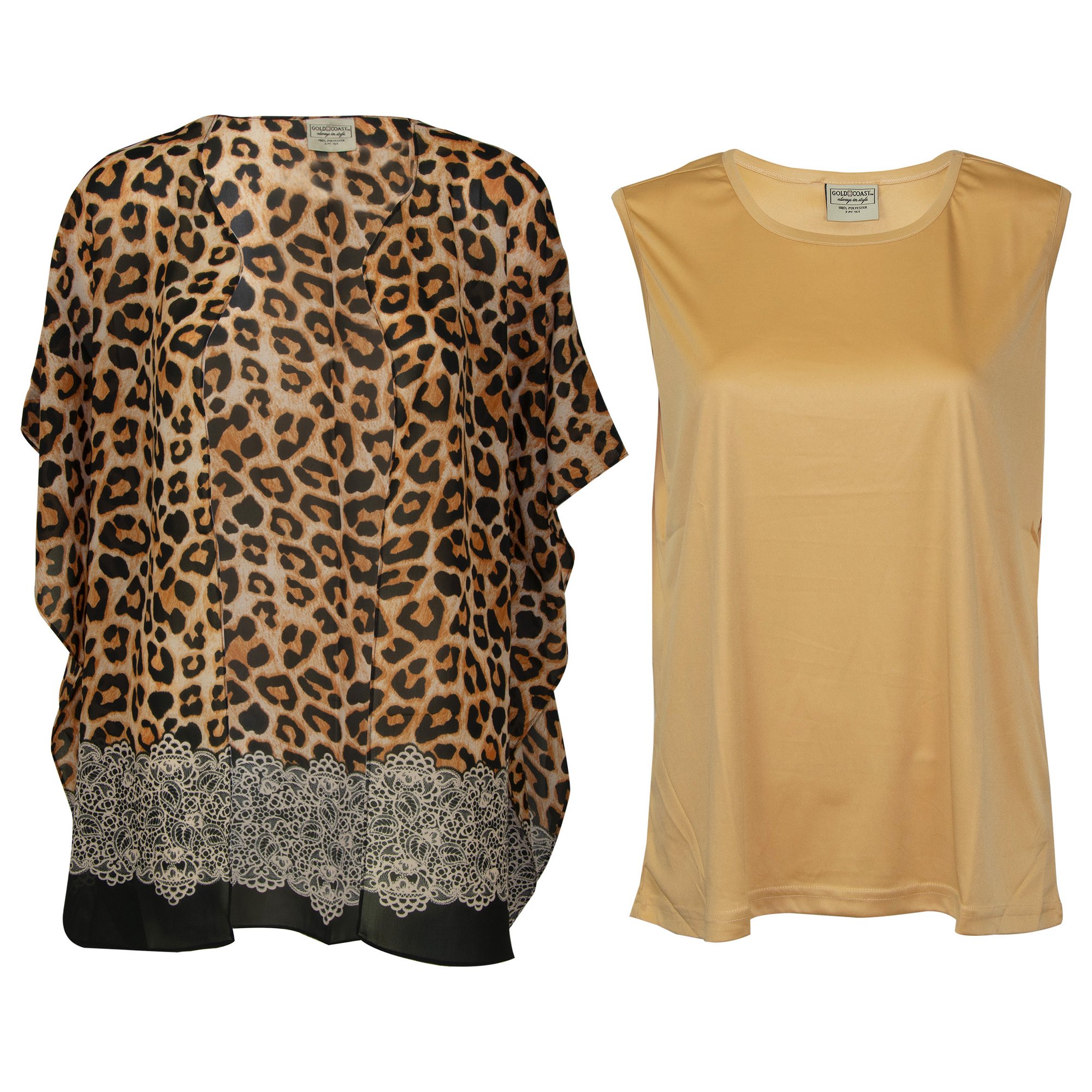 - This women's 2-piece set features an open front kimono blouse with short sleeves in gold and black leopard print and a round neck tank top in gold color underneath.