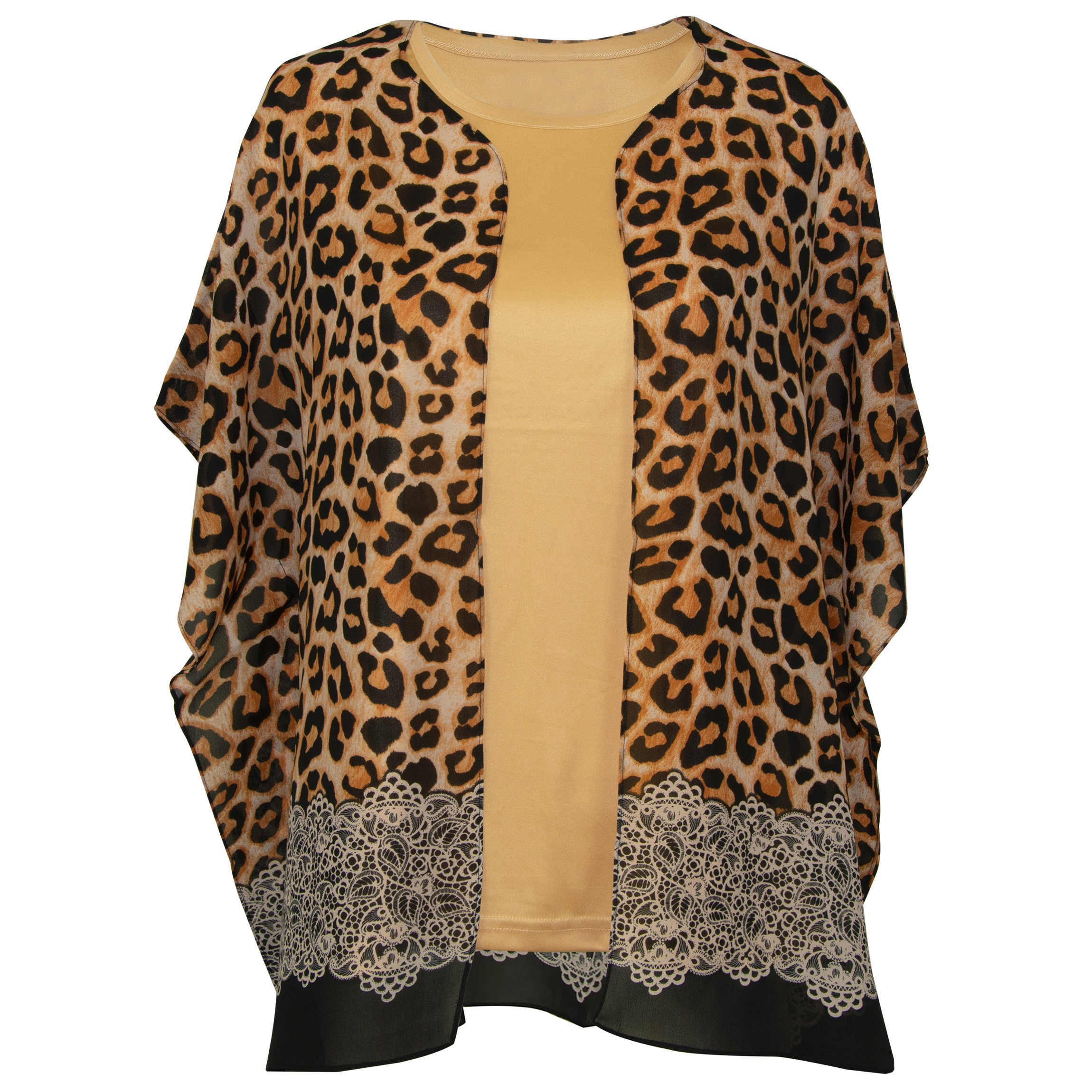 The Gold Coast kimono blouse and tank top set combines chic elegance with a comfortable flowy design for any dressy occasion. Get a layered look in this women's 2-piece set featuring an open front kimono blouse with short sleeves in a sheer gold and black leopard print accented with a white lace print bottom trim, and a round neck tank top in gold color underneath. Look fashionable in this 2-piece top ensemble without compromising comfort. Made of 100% polyester, this relaxed fit top set is lightweight for all-day comfort and is machine washable for easy care. Tagged a women's shirt size xx-large (2XL). Blouse Measurements: 38" Chest, 30" Overall Length, 19" Sleeve Length Center Back. Tank Top Measurements: 26" Chest, 27" Overall Length, 4" Sleeve Length. Made in India.