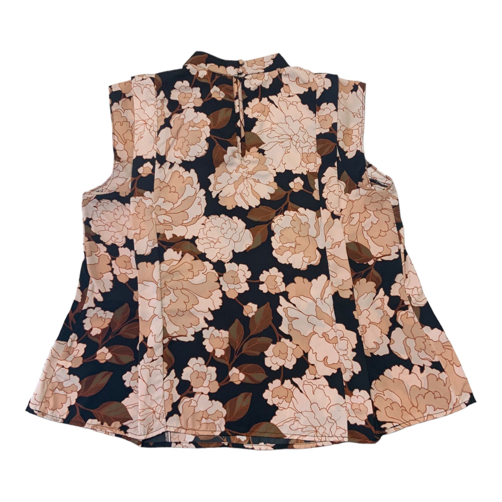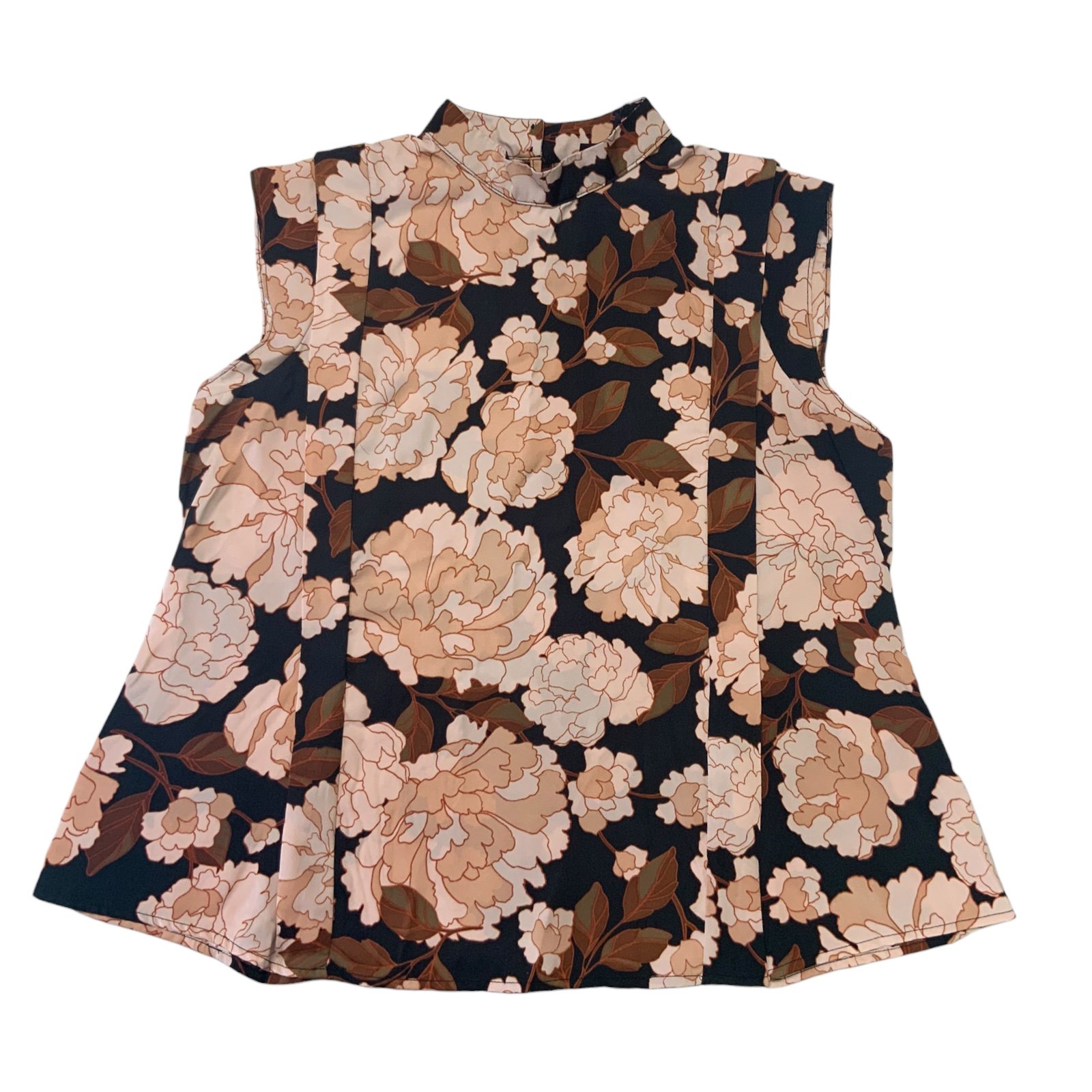 This black, brown and beige floral print blouse from Who What Wear features a mock neckline, A-line fit and a sleeveless cap style arm. The back has a two button closure at the neckline. It's made with a comfortable Poplin fabric (100% Polyester) and is machine washable. This is a women's size Medium. Measurements: 23.5" length, 20" chest.