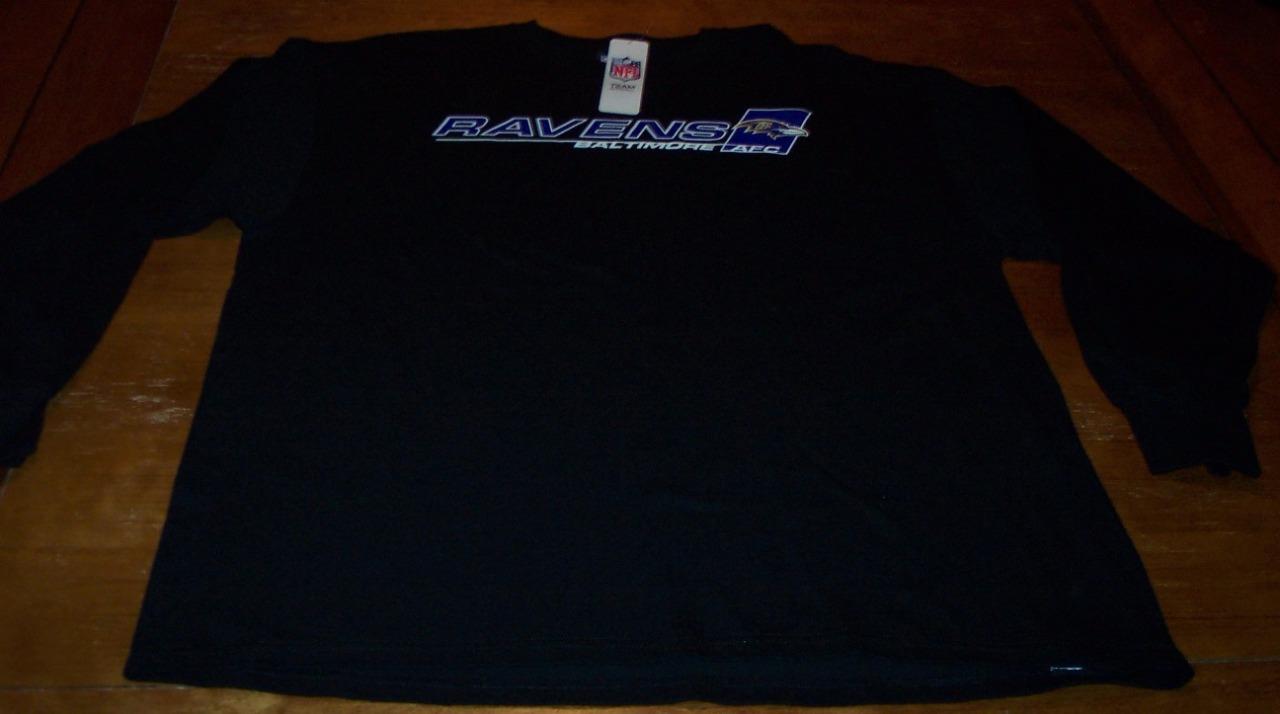 This is a BALTIMORE RAVENS NFL FOOTBALL Long Sleeve T-Shirt. It is a size XL and it is NEW w/ TAG. It is 24 inches from armpit to armpit and 32 inches in length. It is an official NFL TEAM APPAREL Shirt. Combine auctions to save on shipping. AF o