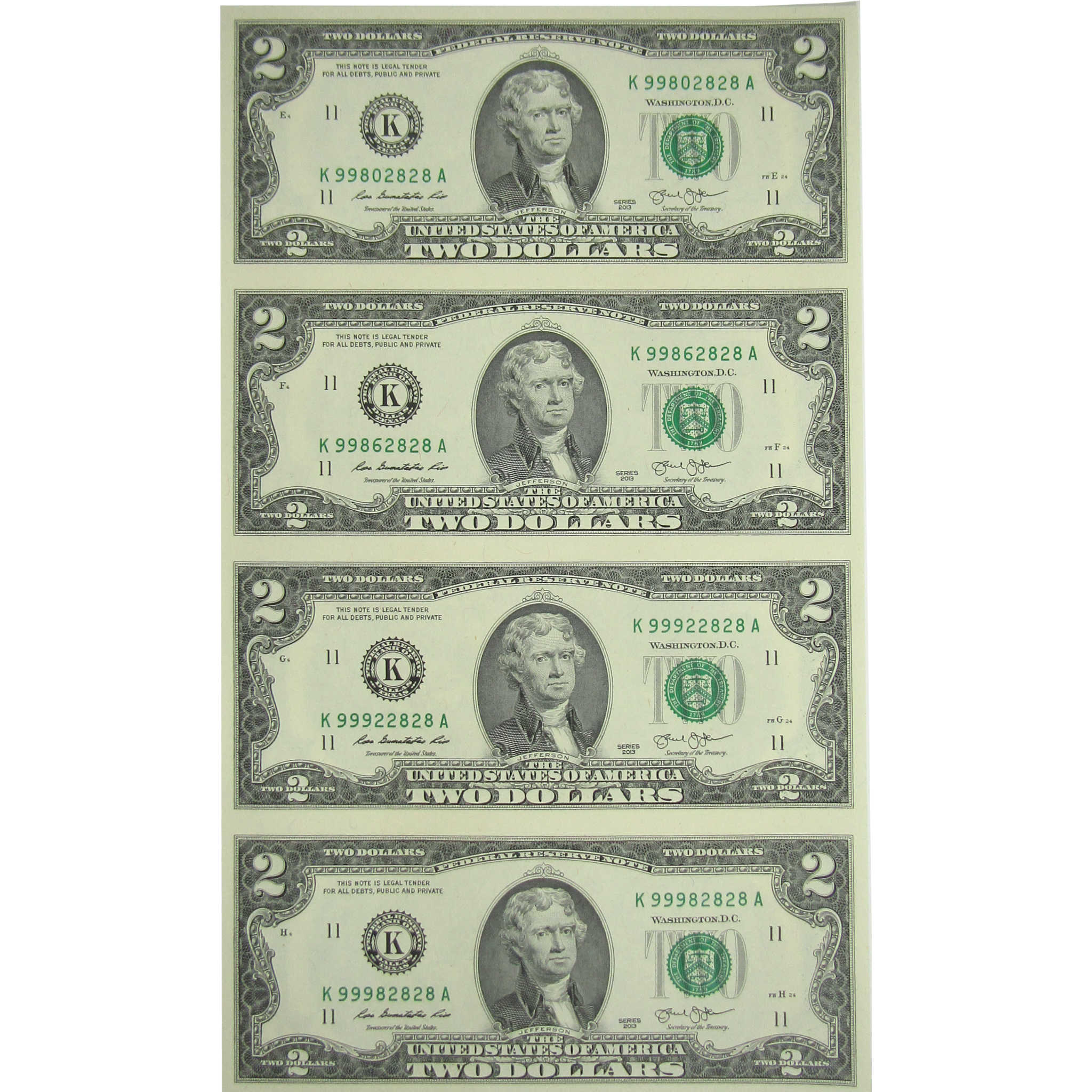 An uncut sheet of four 2013 $2 Small Size Federal Reserve Notes, from The Bureau of Engraving & Printing, in CCU Choice Crisp Uncirculated Condition. Comes with the original government packaging