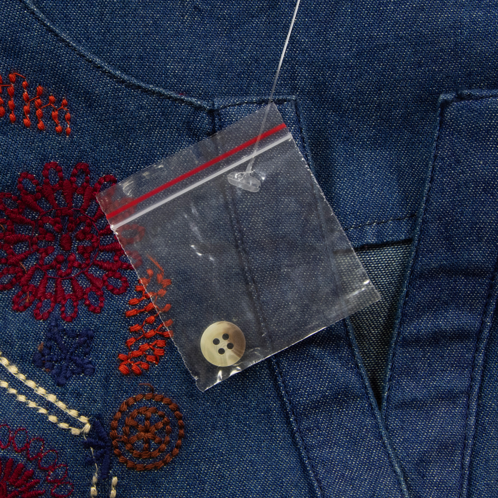 - Enjoy a relaxed fit in this denim blue peasant shirt with colorful embroidery.