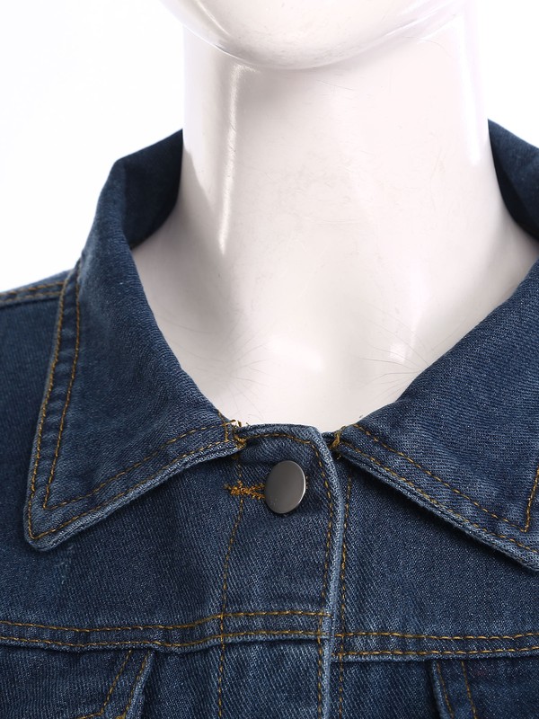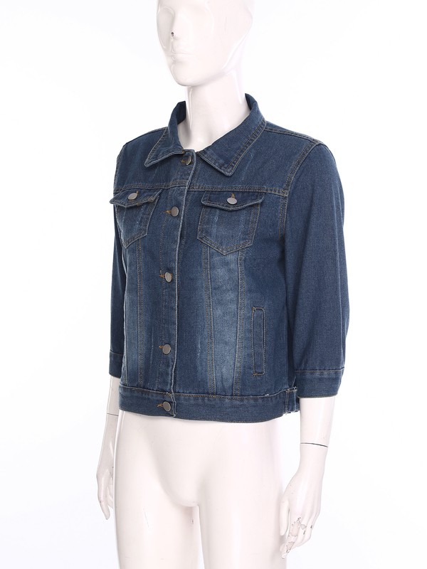 Casual denim jacket features 3/4 sleeve, turn-down collar, button closure, regular fit.
