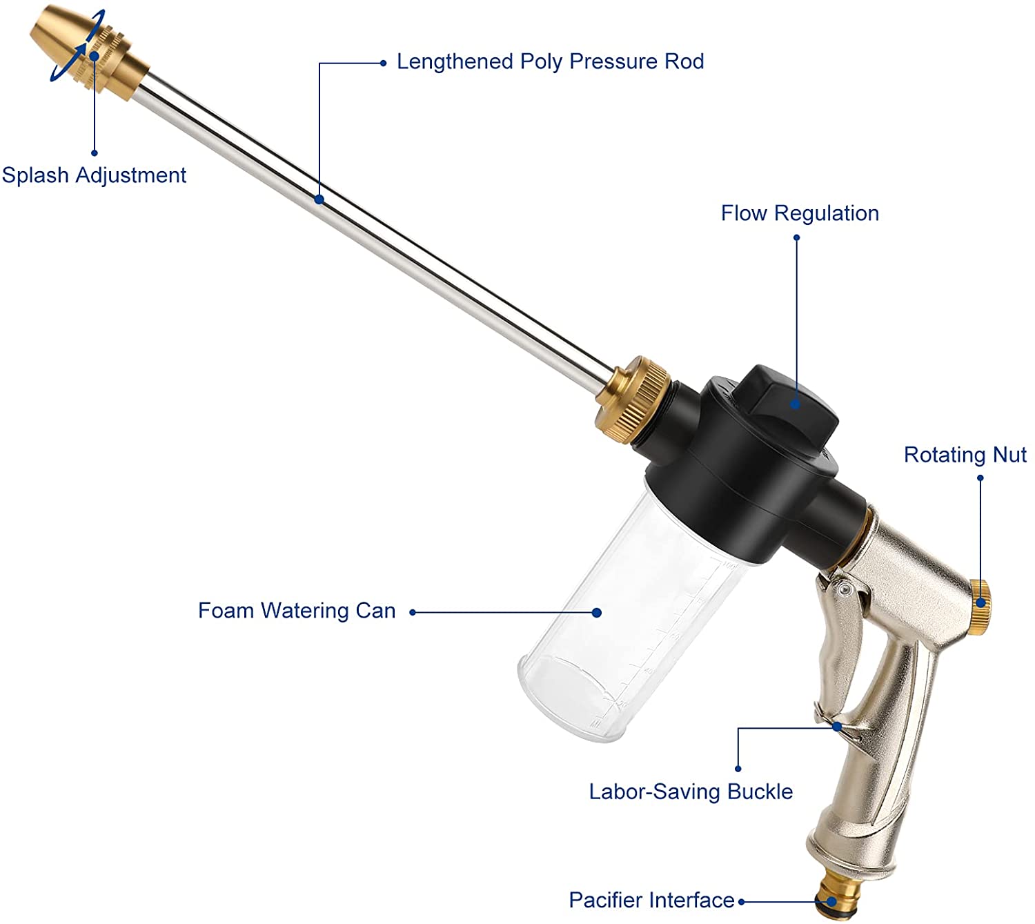 Anti-corrosion, high-pressure sprayer and multi-spray mode, suitable for garden watering and cleaning applications. Strong water pressure makes cleaning easier. The multi-spray mode makes it a convenient and practical tool.