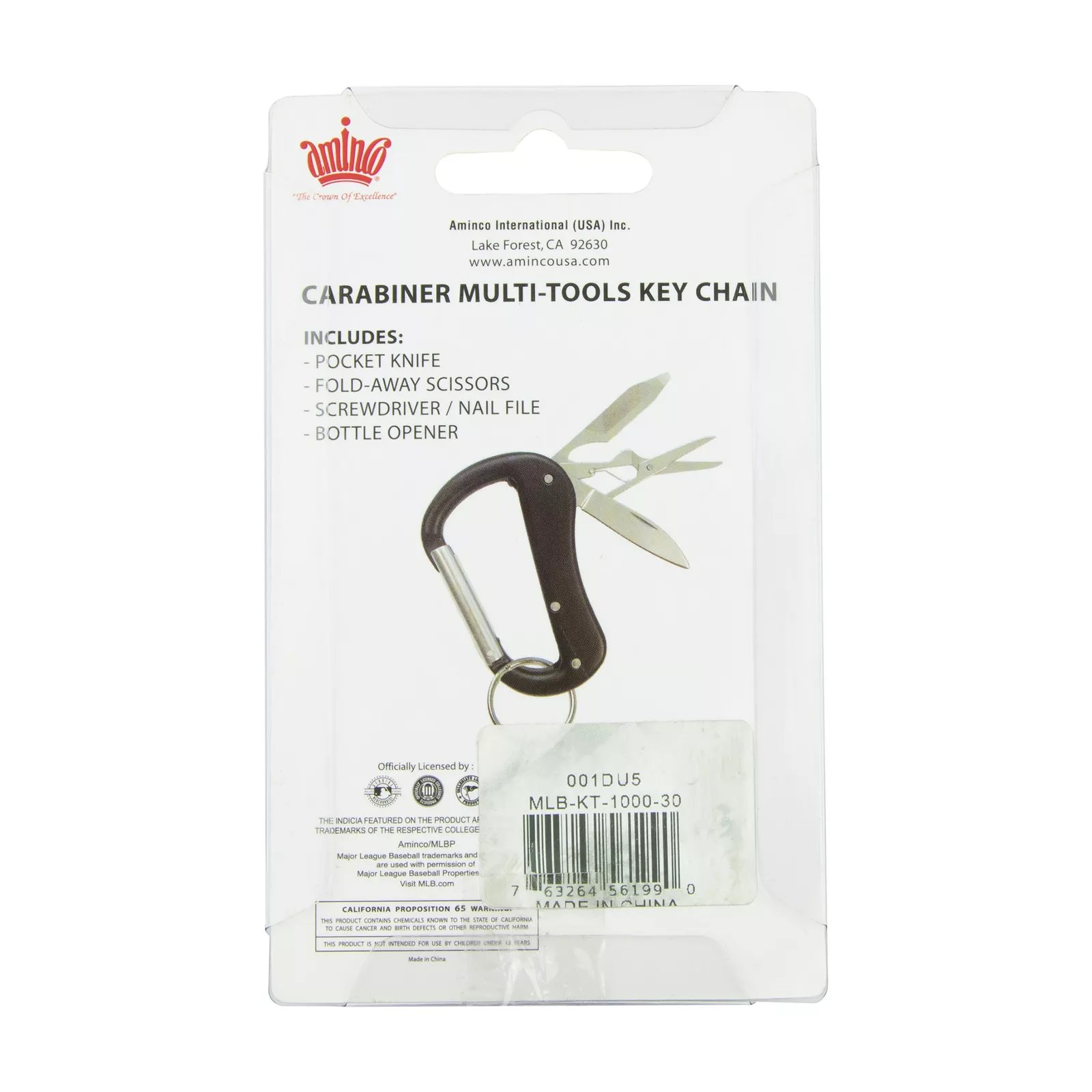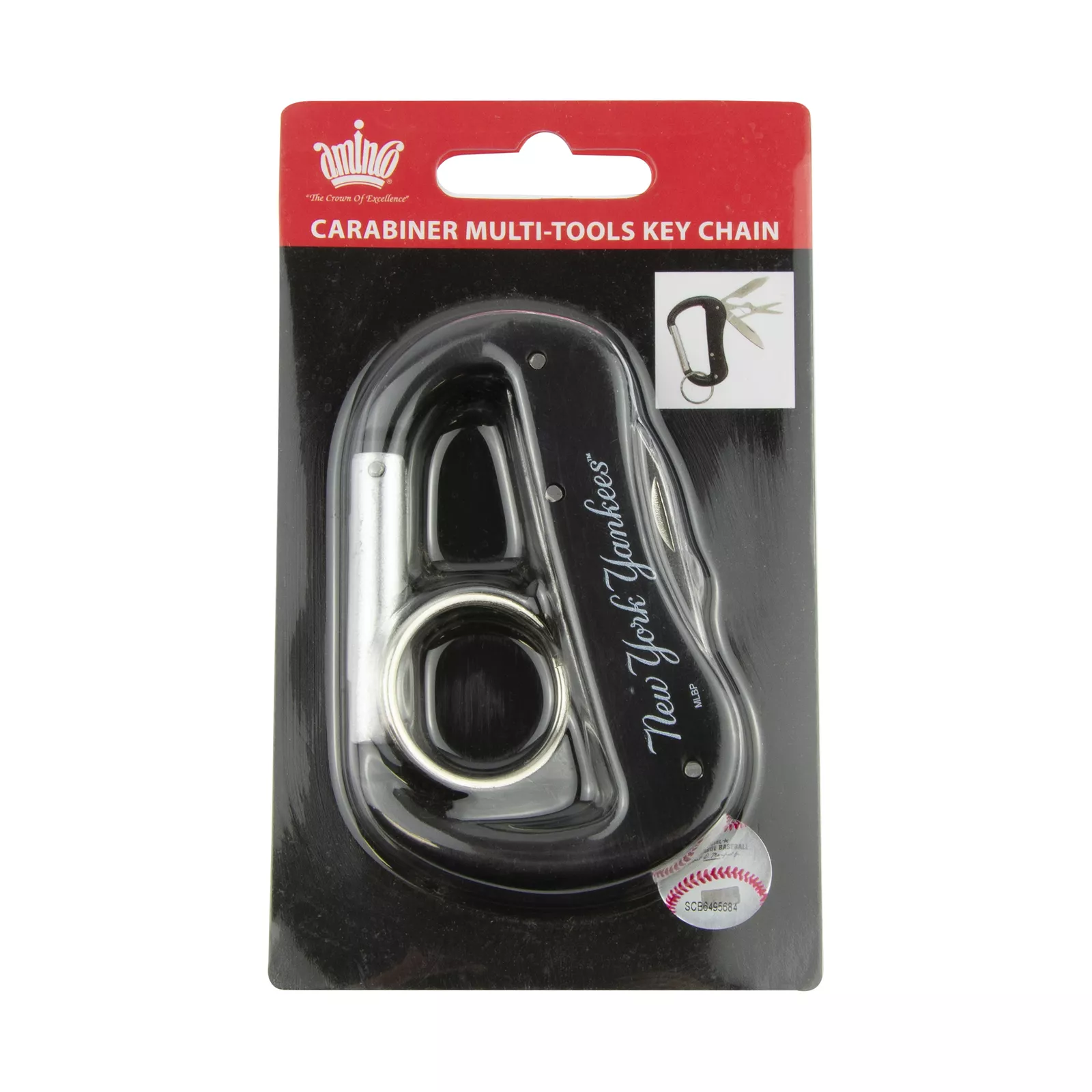 Be prepared for the unexpected with this multi-tool carabiner from Aminco. This officially licensed MLB product features the New York Yankees colorful team name and logo. This three-in-one carabiner, key chain and multi-tool comes equipped with three pop out stainless steel tools that consist of a bottle opener, nail file, screwdriver tip, scissors and knife. It has an enclosed split ring for keys and heavy duty carabiner clip. The carabiner measures 3-1/4-inches by 2-inches. The tool has some sharp edges and removeable parts, not intended for use by children under 13 years old. Made in China.