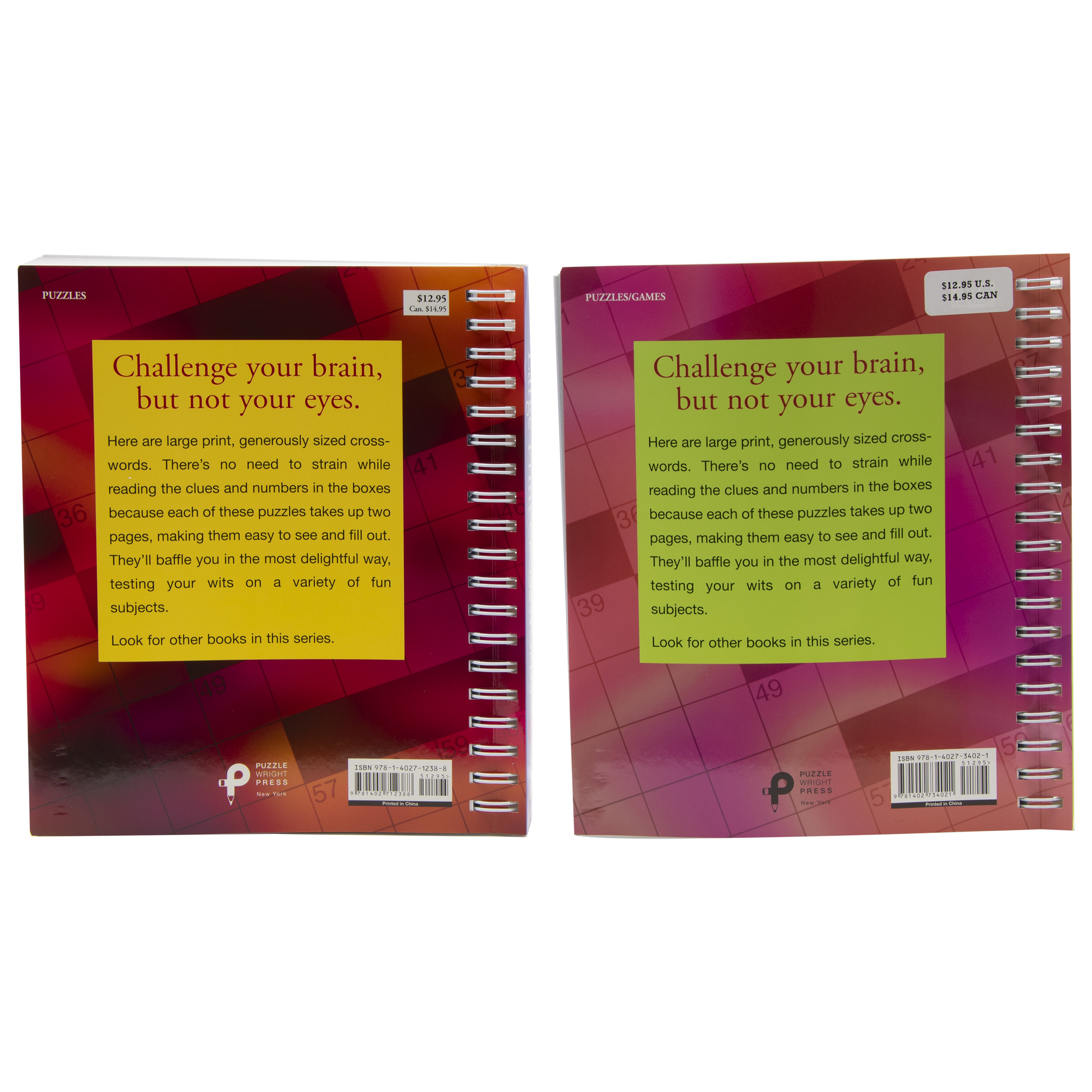 Created and published by Puzzlewright these large print, generously sized crosswords approved by the National Association for Visually Handicapped. There's no need to strain while reading the clues and numbers in the boxes because each of these puzzles takes up two pages, making them easy to see and fill out. They'll baffle you in the most delightful way, testing your wits on a variety of fun subjects. In this set you will receive edition #4 and #5. Each workbook is 288 pages. Dimensions: 9” W x 10” L x 1” D.
