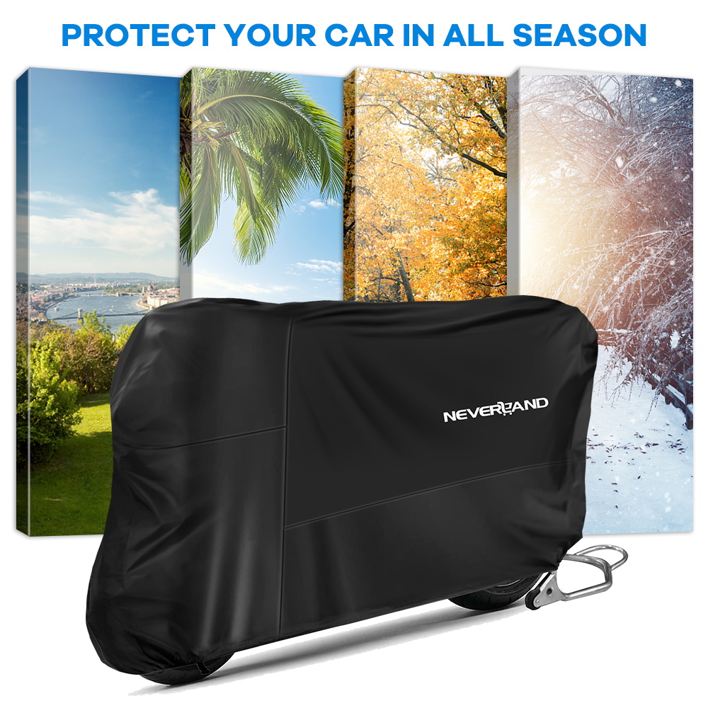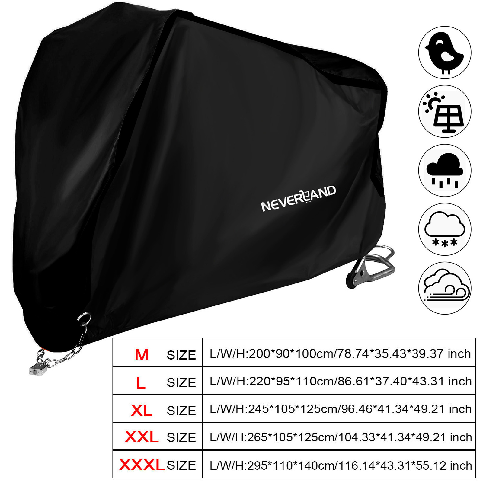 【UNIVERSAL FIT】- NEVERLAND motorcycle cover is universal. Designed to fit multiple motorcycles up to 96 inch motorbikes (for Harley Davidson/Honda/Suzuki/Kawasaki/Yamaha and more)—Our cover fits most on and off-road standard-sized bikes.