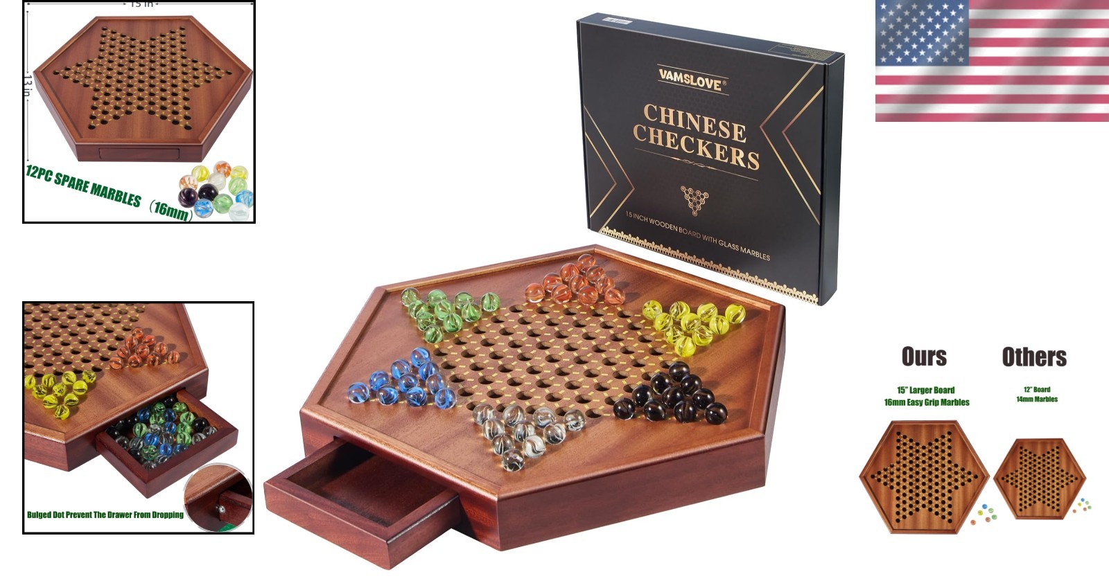 Larger Board, Larger Ball: This exquisite board is crafted from high-quality wood, featuring an upgraded larger size measuring 15"L by 13"W by 1.75"T, ensuring easy grasp for players of all ages with 16mm marbles.