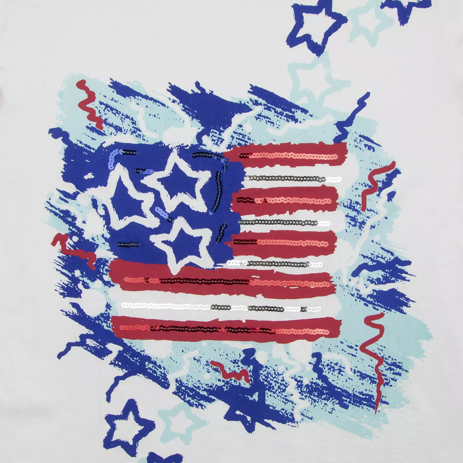 - This festive t-shirt features a graphic print of various stars and stripes in red, white, and blue with red, silver, and blue sequin accents.