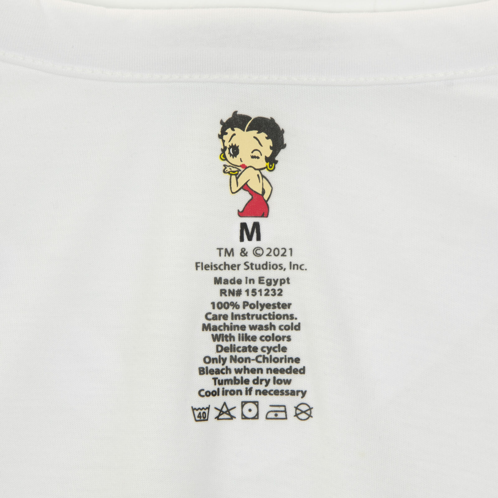 Show off your playful side in this officially licensed Betty Boop women's graphic print novelty t-shirt. Fans of vintage cartoons will enjoy this classic white tee with short sleeves and a V-neck featuring a graphic print of the 1930s cartoon character, Betty Boop with her signature wink and her trademark name logo in pink. Made of 100% polyester, this women's lightweight t-shirt is soft and breathable for all-day comfort and is machine washable for easy care. Tagged a women's shirt size medium. Measurements: 19" Chest, 25" Overall Length, 7" Sleeve Length. Made in Egypt.