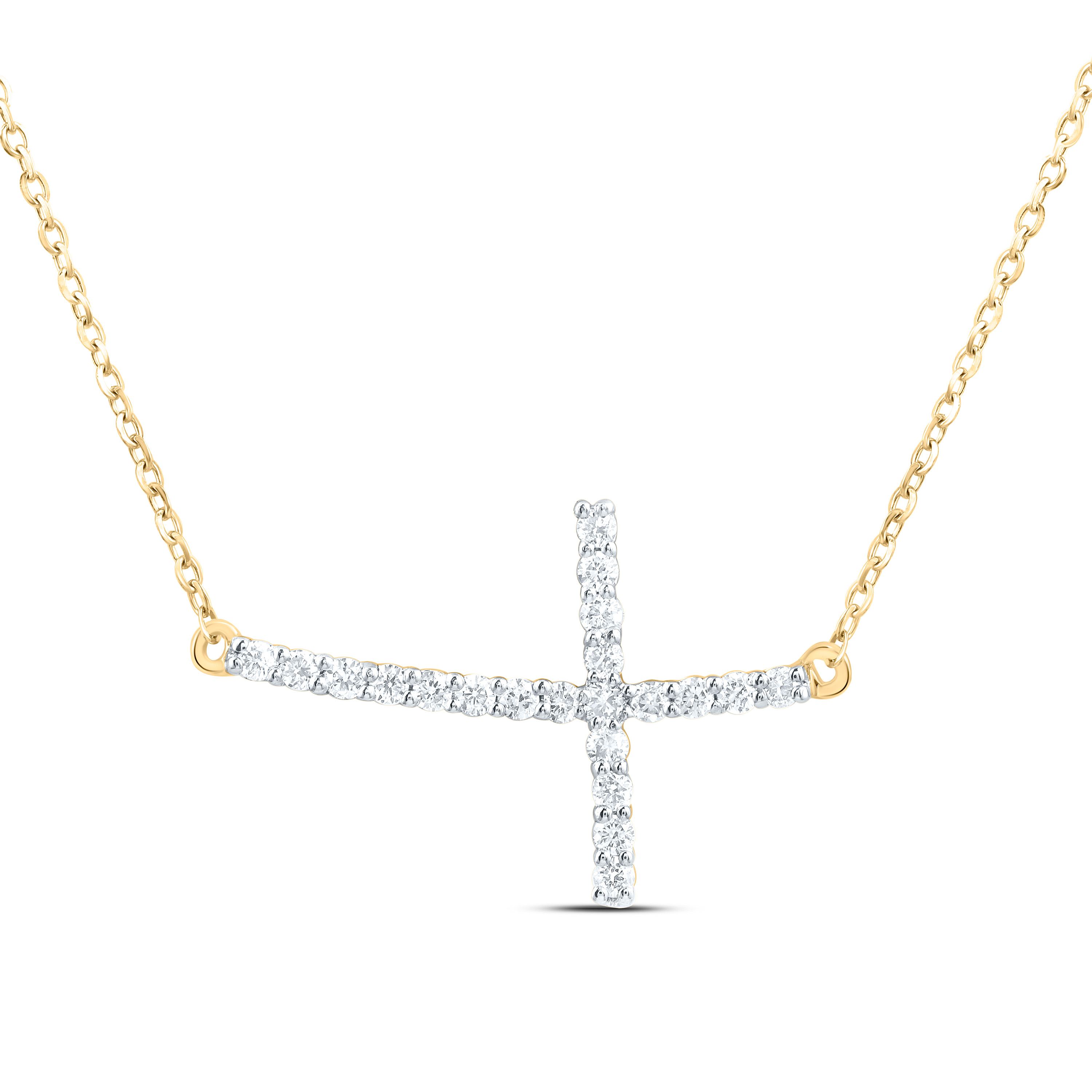This eye-catching Diamond Curved Sideways Cross Necklace is crafted in 10k Yellow Gold and shimmering White Diamonds, ensuring sparkle from every angle. Radiant with 0.20 ct. t.w. of Diamonds, this necklace is high-polished to a lustrous shine. Exclusive style has a well built frame to withstand everyday wear and tear. The Diamonds are secured in Prong setting close together, making the overall appearance larger and lustrous. Cable Link chain paired with this necklace set. These are all 100% genuine Round cut Diamonds with matching clarity and color throughout. This necklace measures 18" long and weighs approx. This one of a kind piece would make a perfect addition to your jewelry collection.
