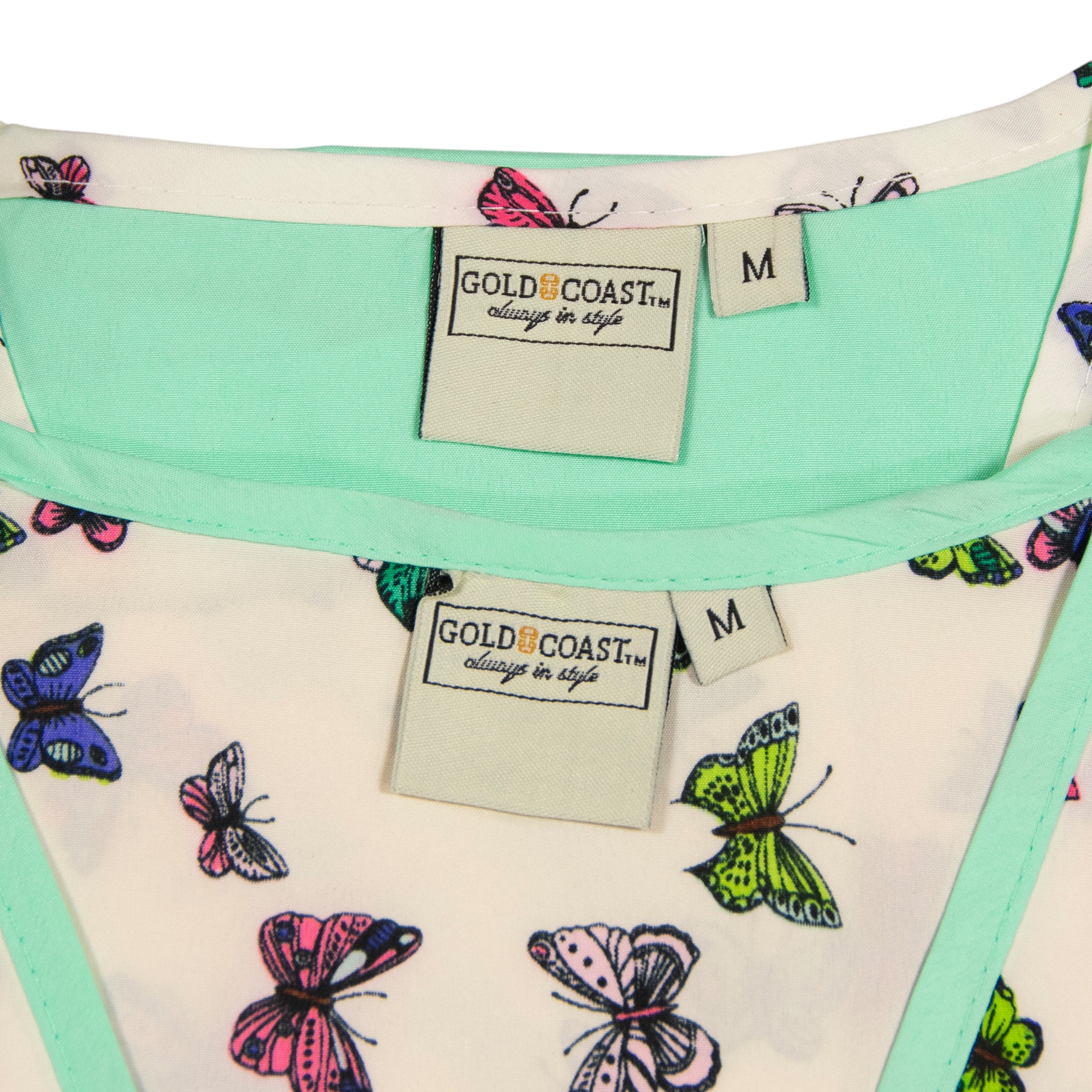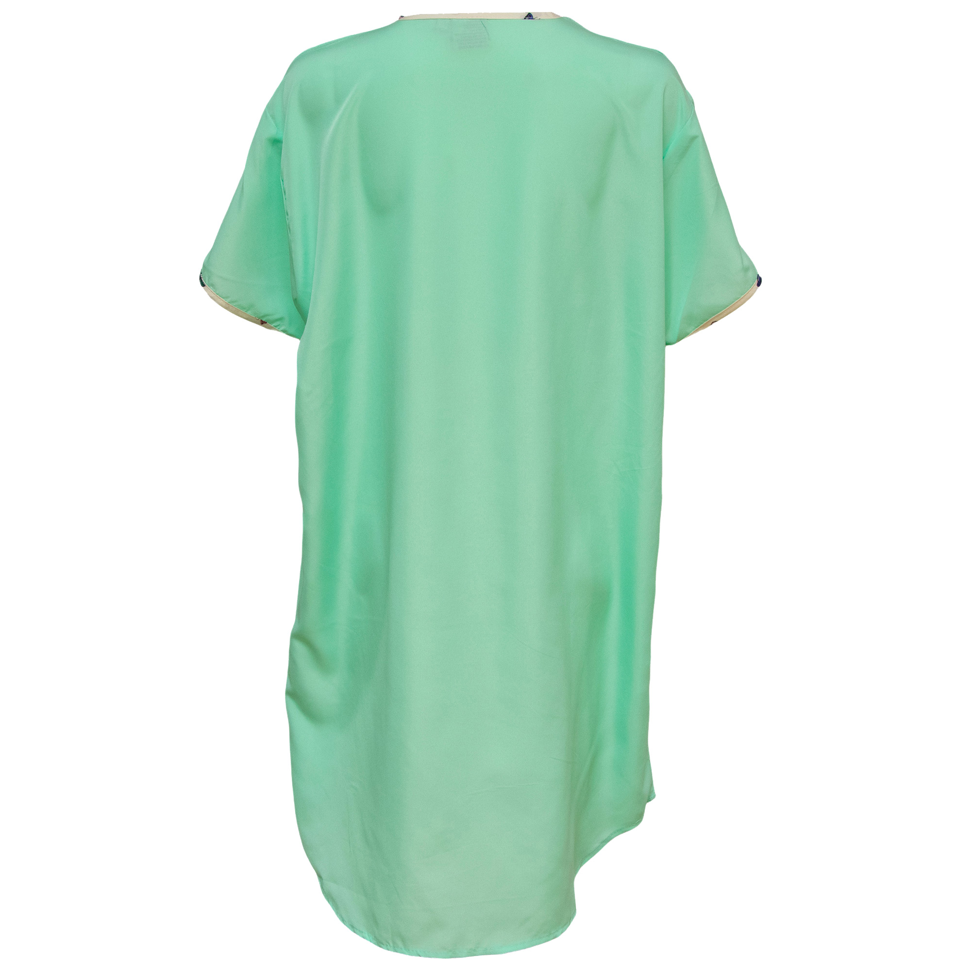 Be comfortable and stylish in this set of women's satin night shirts from Gold Coast. Both knee length nightgowns feature a v-neckline and short sleeves. One night shirt is a solid light green with a butterfly patterned trim while the coordinating shirt is opposite with a butterfly pattern and light green trim. The lightweight women's pajama shirts are made from a 100% Polyester material. Machine washable. This set comes in a women's size medium. Measurements: 37" length, 23" chest, 8" sleeves. Made in India.