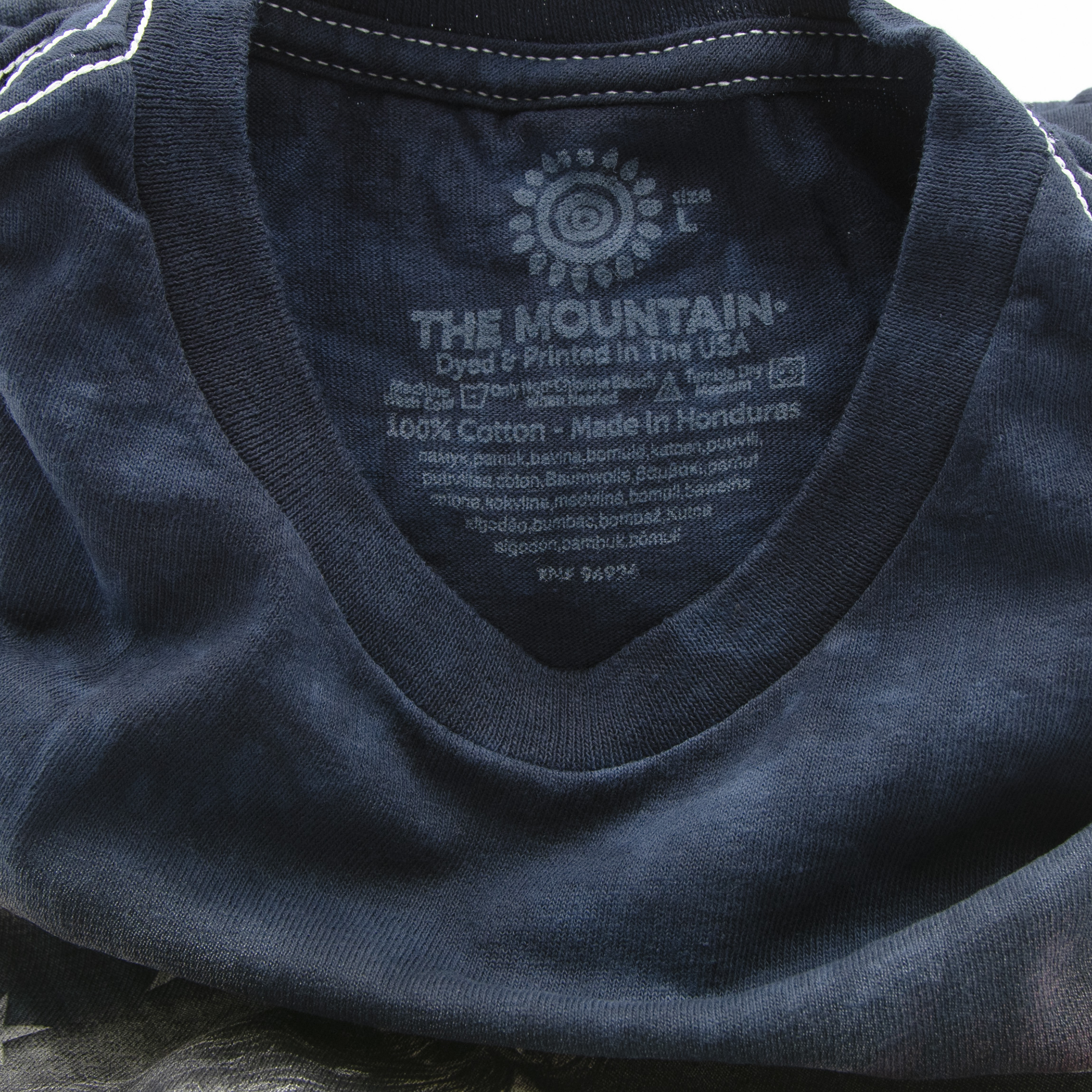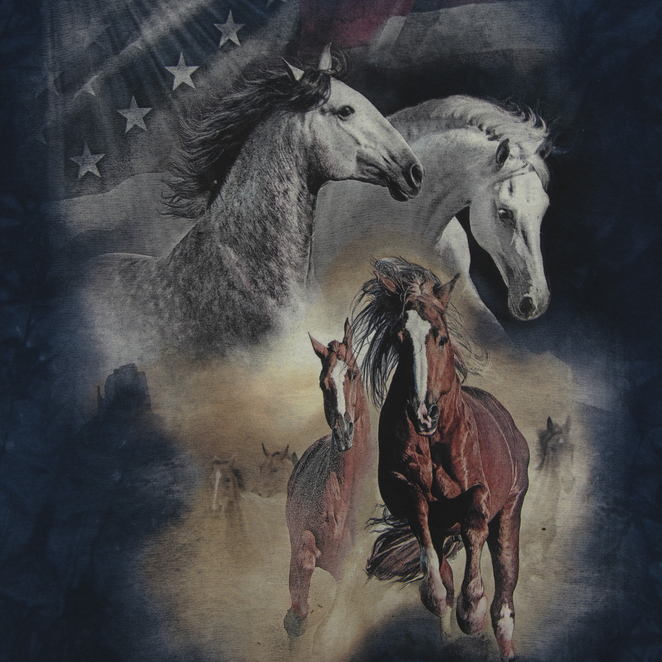Show your American West spirit in the Born Free horses men's graphic-print t-shirt by The Mountain. Perfect for casual everyday wear, this short sleeve tee with crew neck features a front patriotic graphic print of wild horses roaming free against an American flag backdrop with a unique tie-dyed background pattern. A blend of comfort and style, this colorful 100% cotton t-shirt has reinforced double stitching for durability and is machine washable for easy care. Made in Honduras. Dyed and printed in the USA. Tagged a men's shirt size large. Measurements: 22" Chest, 28" Overall Length, 7" Sleeve Length.