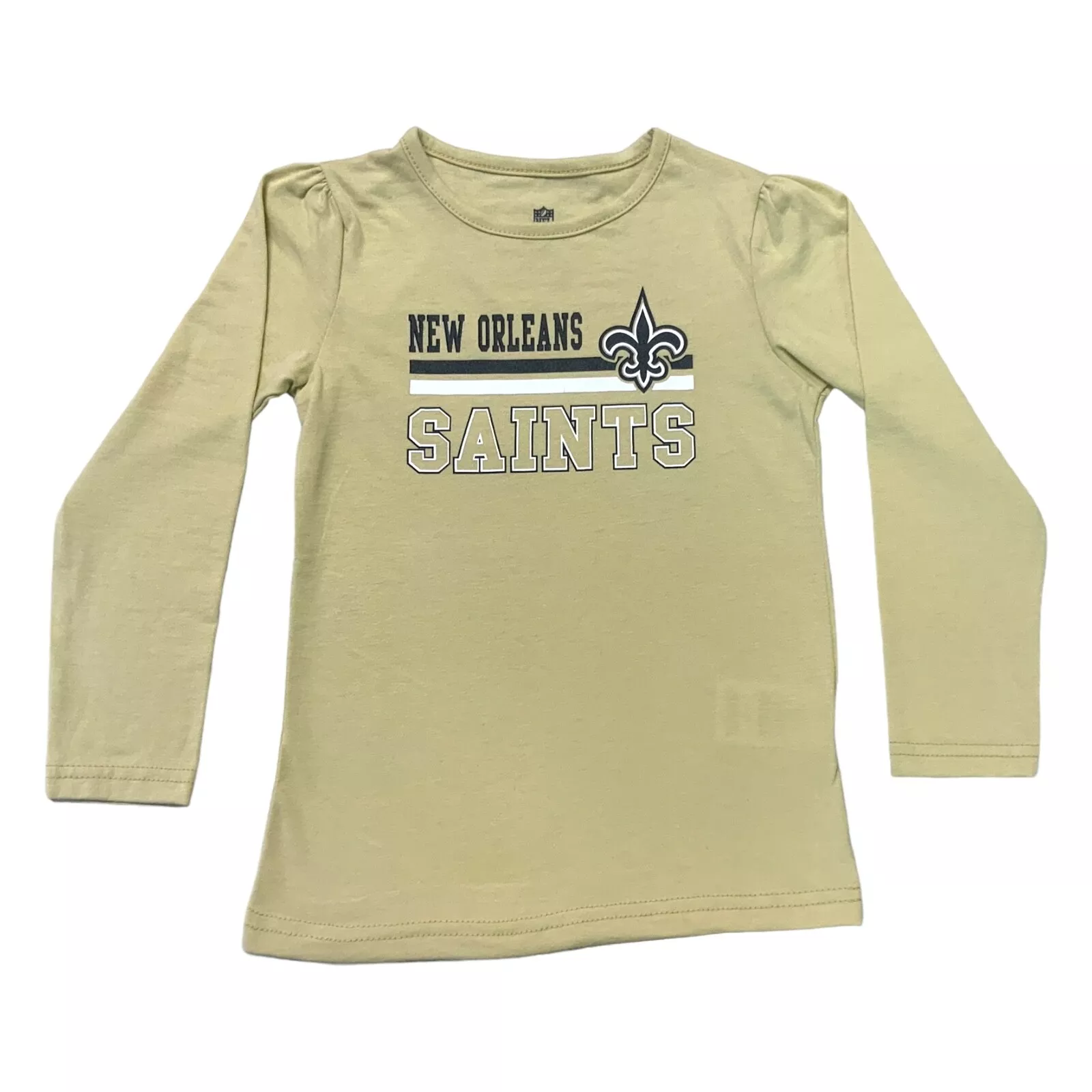 Get her ready for good times with this girls' officially licensed New Orleans Saints 3-piece set! This quality garment will last for seasons to come! This three-piece set includes one grey short sleeved T-Shirt made of 90% cotton and 10% polyester, one long sleeved gold T-shirt made of 100% cotton, and one pair of black pants made of 100% Cotton. A gentle elastic waistband on the pants provides a more comfortable fit for active little girls. This set is size 4T. Machine washable.
