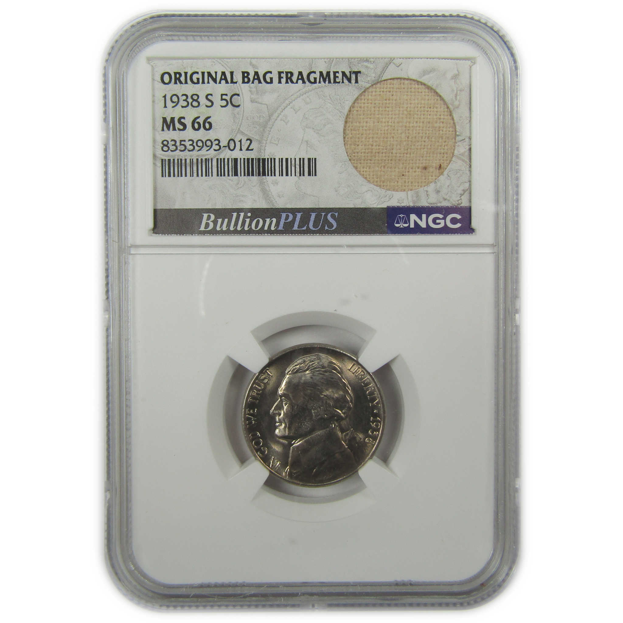 A genuine 1938 S Jefferson Nickel Coin, graded and certified MS 66 by NGC. Comes with a fragment of an original vintage canvas bag embedded in the label