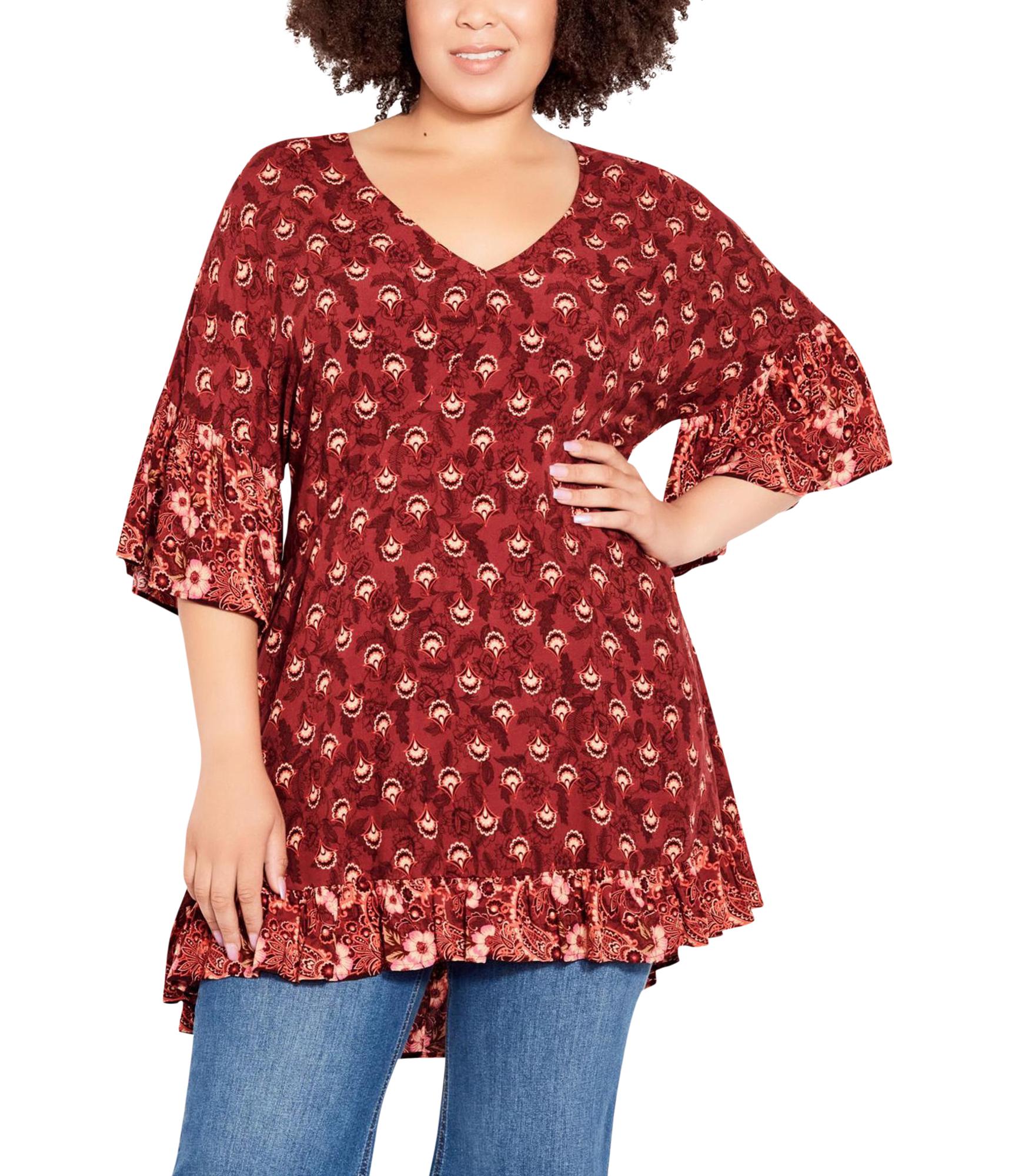 avenue Womens Ruffle Trim Tunic Blouse, wine, Plus Size, 22/24