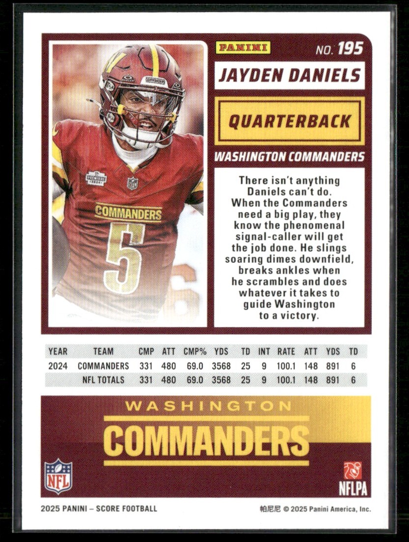 | 2025 SCORE JAYDEN DANIELS WASHINGTON COMMANDERS #195 |