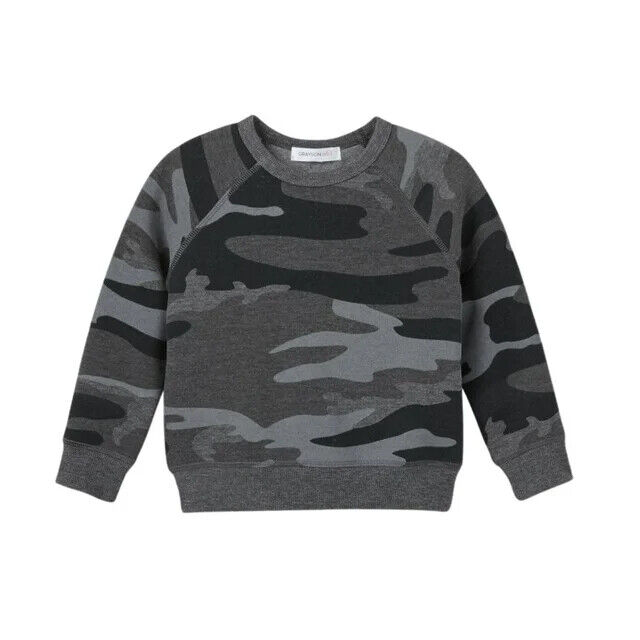 This toddlers sweatshirt from Grayson Mini features a camouflage print. This sweatshirt is made with a comfortable jersey fabric and comes in a classic fit with ribbed crewneck and hem. Double stitching on crewneck, sleeves, hem, waistband. It's made from a blend of 65% Polyester and 35% Rayon and is machine washable. This is a unisex toddlers size 4T. Measurements: 16" length, 14" chest, 16.5" raglan sleeve length.