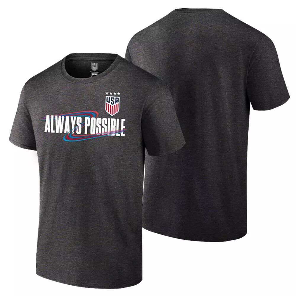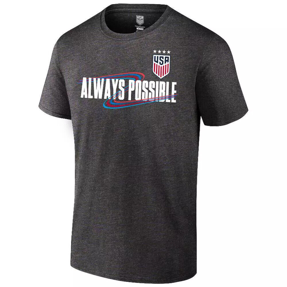 Show your support for the United States Women's National Soccer Team with this graphic tee. The front features the United States National Team logo and a special "Always Possible" graphic print. This casual fit tee has a crew neckline and coverstitch hem and sits at the hip. Made from a lightweight blended fabric (60% Cotton/40% Polyester), the shirt is machine washable. Officially licensed. Unisex adult size X-Large. Approximate measurements: 30" length, 23" chest, 8" sleeve.