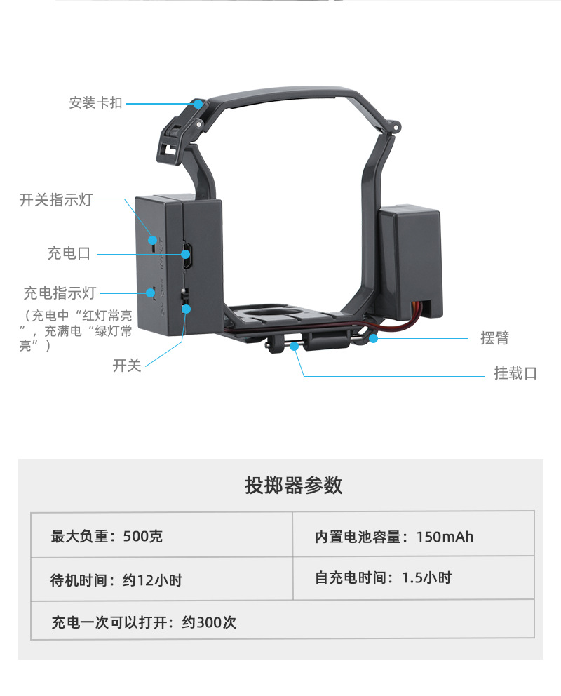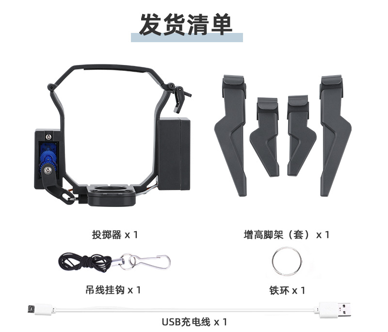 Packaging list: Thrower x 1 raised tripod (set) x 1 USB charging cable x 1 suspension hook x 1 iron ring x 1 instruction manual x 1