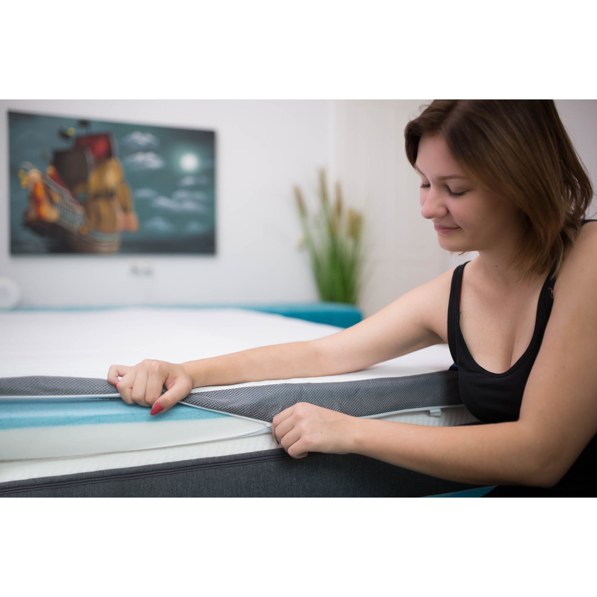 Der Topper besteht aus zwei Schichten: Eine Schicht aus druckentlastendem, anschmiegsamem Gelschaum und eine Schicht aus stützendem Komfortschaum. So kombiniert er Druckentlastung und Stützung, unterstützt damit die Wirbelsäule vom Kopf bis zum Becken und bietet Komfort und Elastizität für Seiten-, Bauch- und Rückenschläfer. Rücken- und Gliederschmerzen, Schlafstörungen und Kopfschmerzen können so vorgebeugt werden. Die erhöhte Liegeposition erleichtert das Ein- und Aussteigen aus dem Bett und erzeugt ein Boxspring-Feeling.