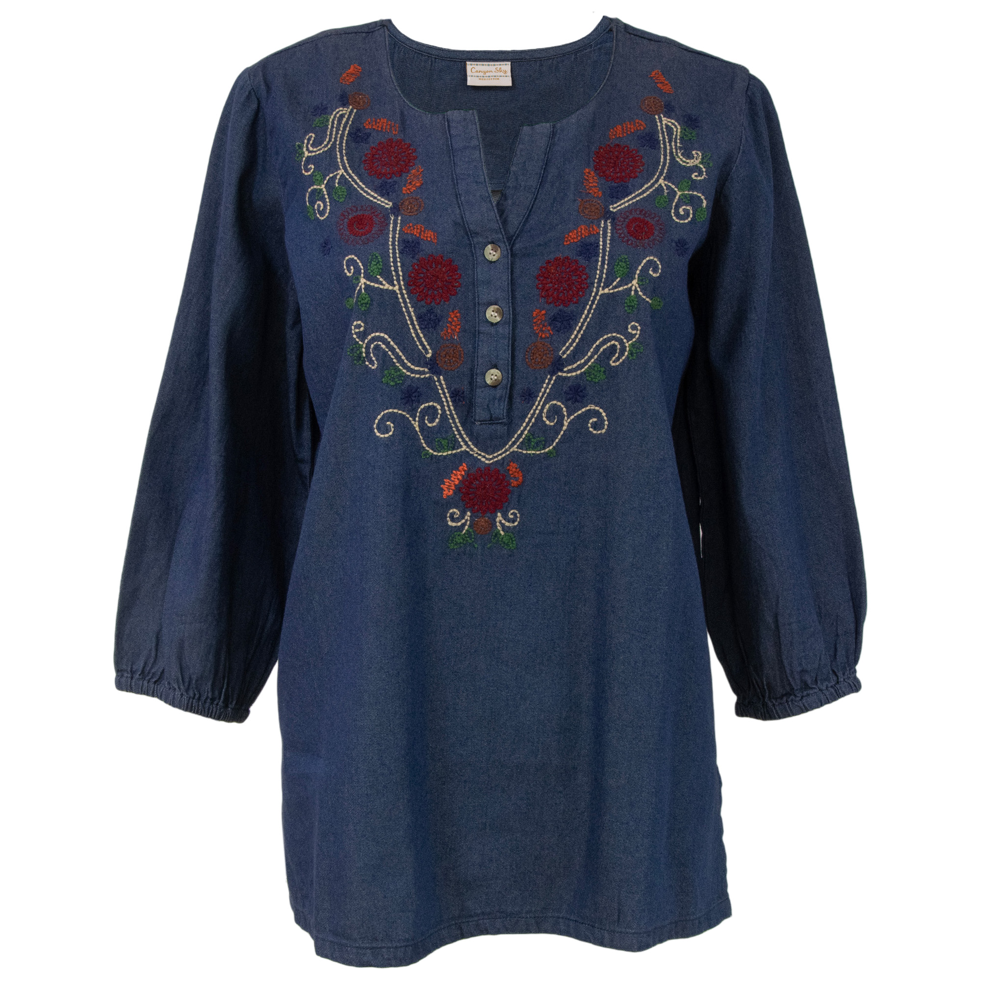 Perfect for casual everyday wear, the Canyon Sky women's embroidered denim long sleeve peasant shirt combines a relaxed construction with feminine style. This women's long sleeve shirt features a colorful embroidered floral design with a Henley-style three-button front, full sleeves with elastic cuffs, and a split hem for a comfortable fit. Made of 100% cotton, this denim tunic-style shirt is built for durability and is machine-washable for easy care. Tagged a women's shirt size small. Measurements: 22” Chest, 27.38” Overall Length, 19" Sleeve Length.