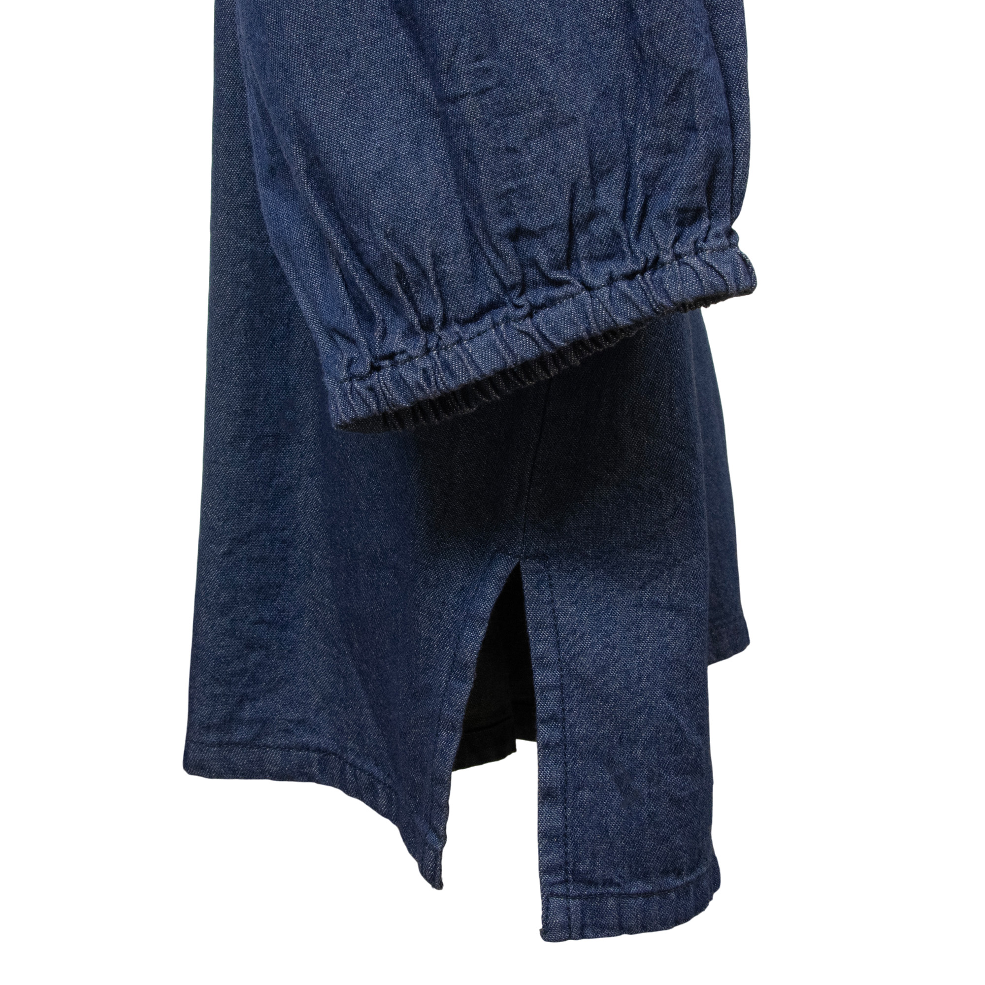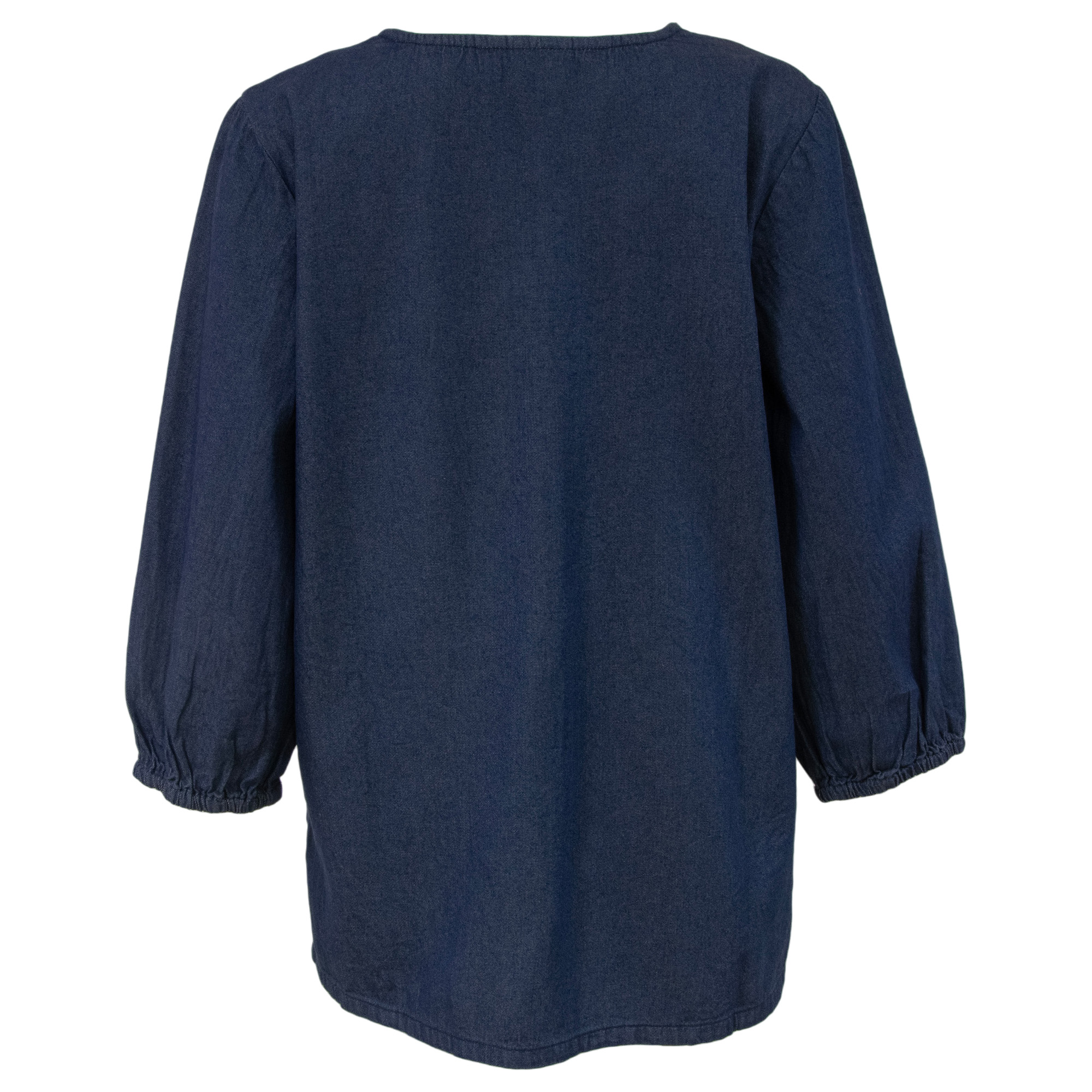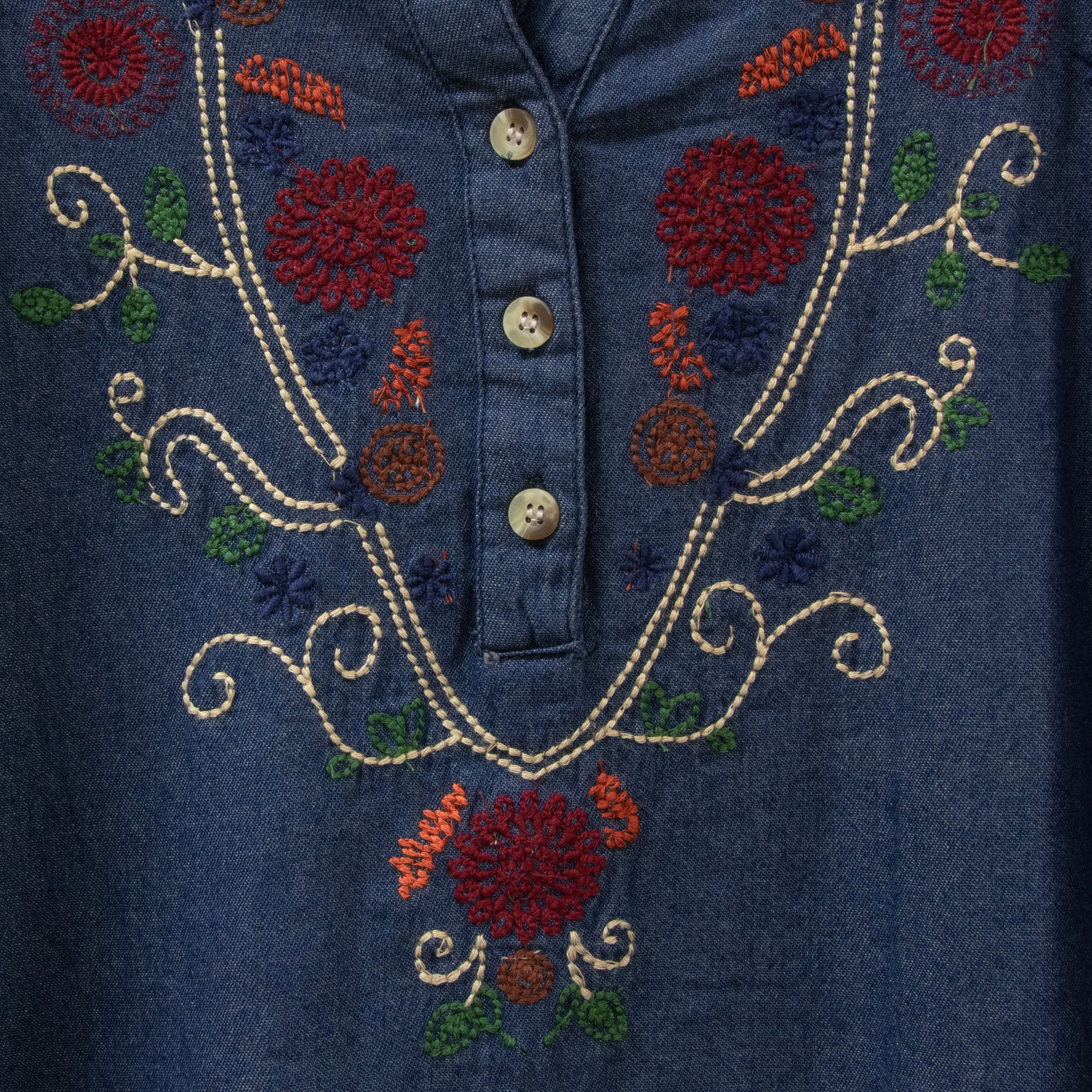 - Enjoy a relaxed fit in this denim blue peasant shirt with colorful embroidery.